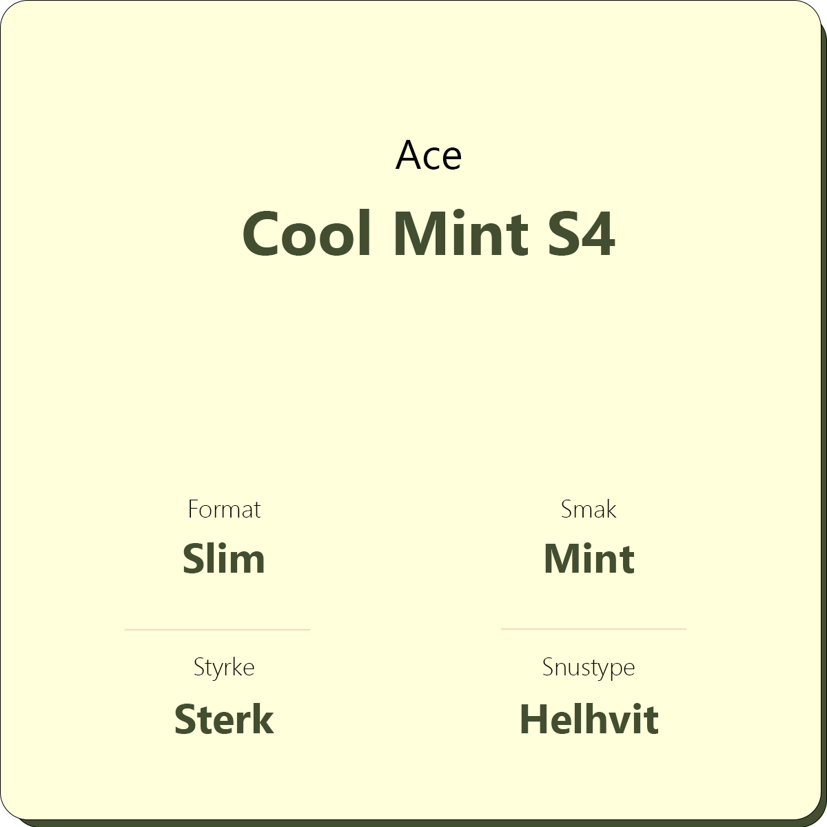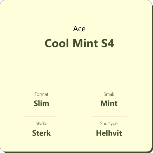 Ace Cool Mint S4 er en helhvit snus med smak av mint og sterk peppermynte i en slim porsjonspose. Med 12 mg/g nikotin er Ace Cool Mint en sterk snus. Er du på utkikk etter en snus med enda mer styrke, og den samme gode smaken av mynte? Da anbefaler vi Ace X Cool Mint S5 med 16 mg/g nikotin.