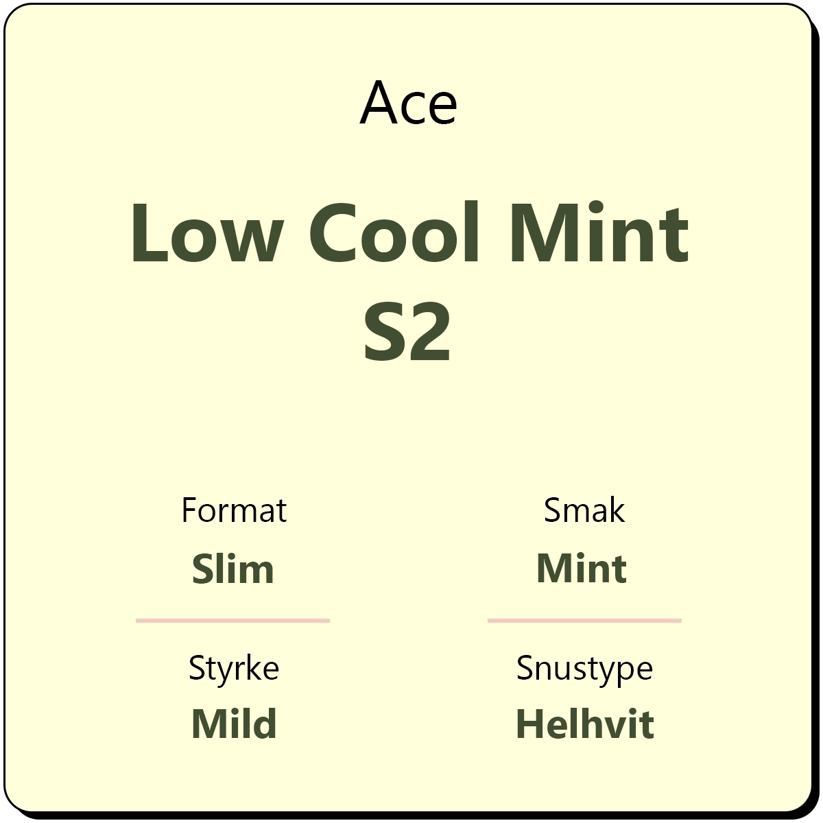 Ace Low Cool Mint S2 er en svært mild snus med kun 6 mg/g nikotin. Low er en ny serie fra Ace i tillegg til Ace Superwhite og Ace X. Low-serien har et fokus på lavere nikotininnhold med den samme smaken som resten av Ace snusen. Ace Low Cool Mint har en smak av spearmint i helhvite porsjonsposer med et slim format.