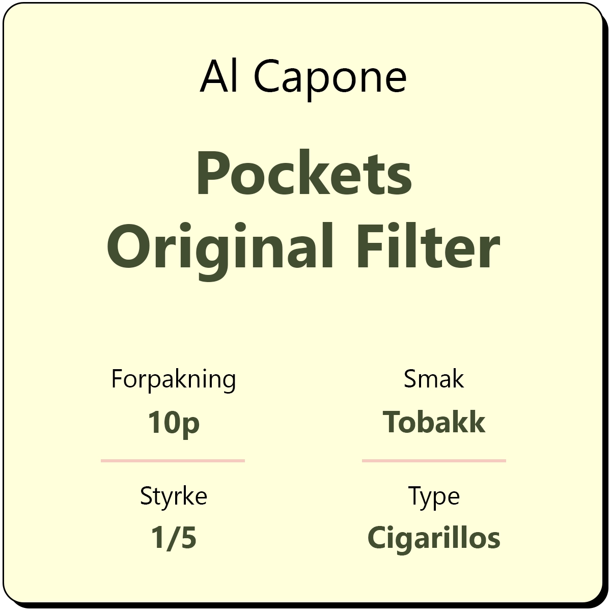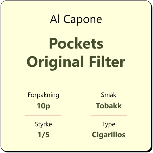 Al Capone Pockets Original Filter er en pakke med 10 cigarillos fra Al Capone i lommeformet format. Cigarillosene er laget med solmodne tobakksblader fra amerikansk Virigina tobakk av den originale oppskriften fra Al Capone. Cigarillosene er milde og har et filter som filtrerer bort enda noe av skarpheten.