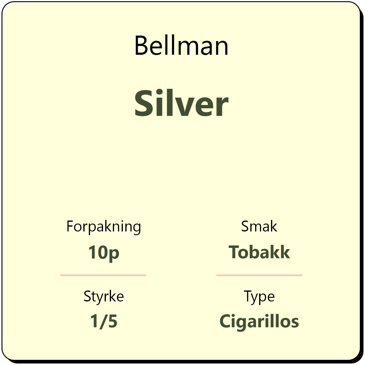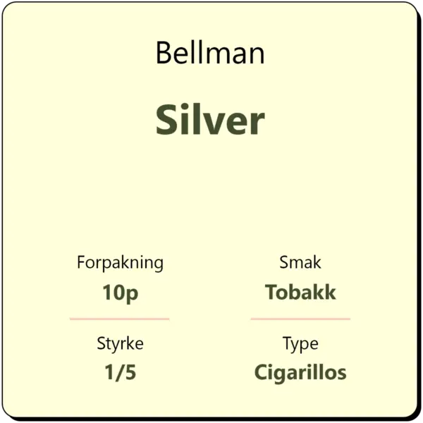 Bellman Silver 10p er en cigarillos bestående av tobakk fra Java, Cuba og Brasil. Cigarillos fra Bellman leveres i en 10-pakning.