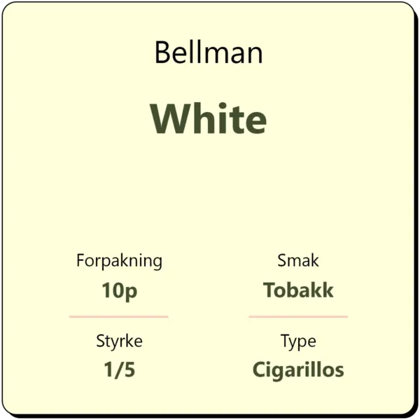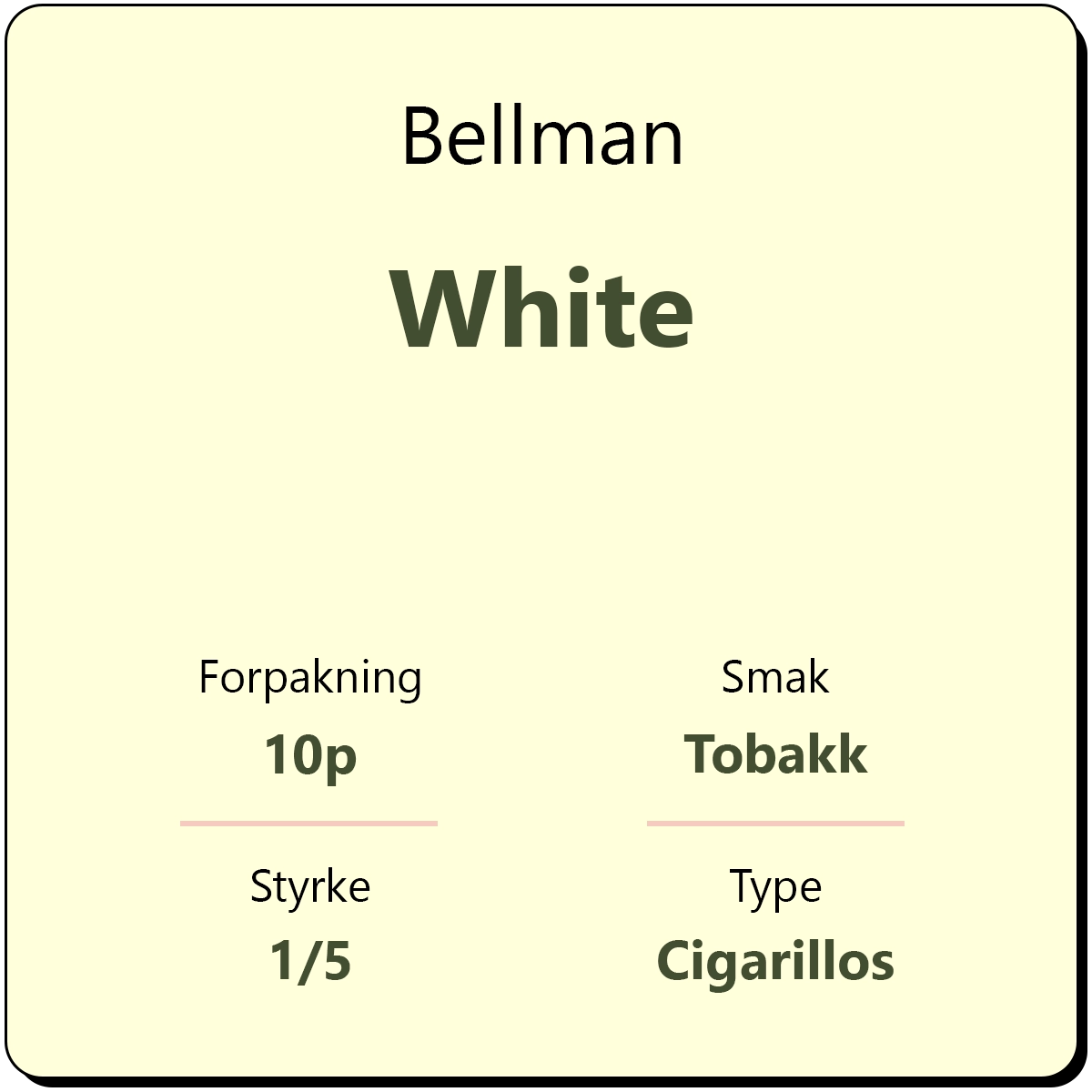 Bellman White 10p er en cigarillos bestående av tobakk fra Java, Cuba og Brasil. Cigarillos fra Bellman leveres i en 10-pakning.