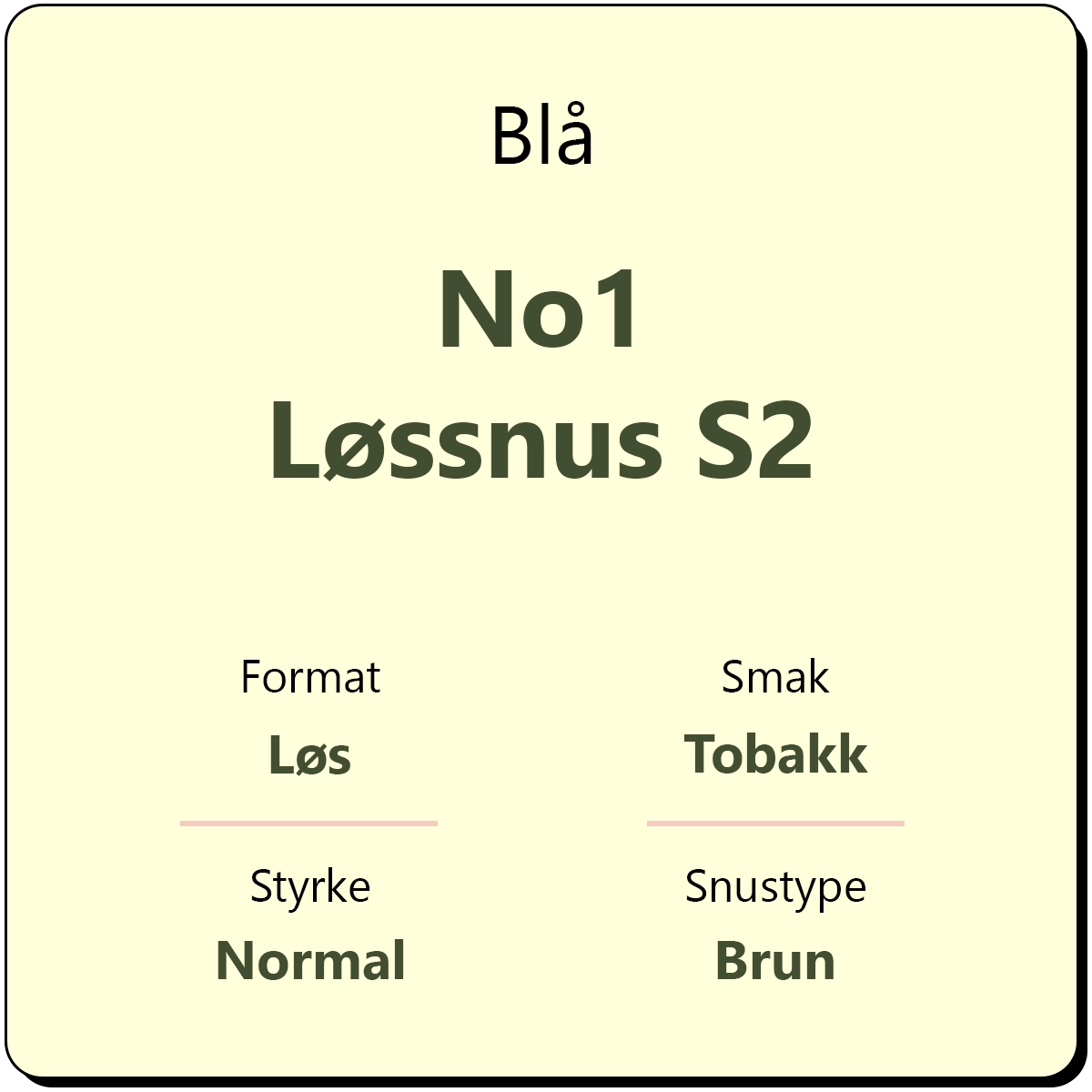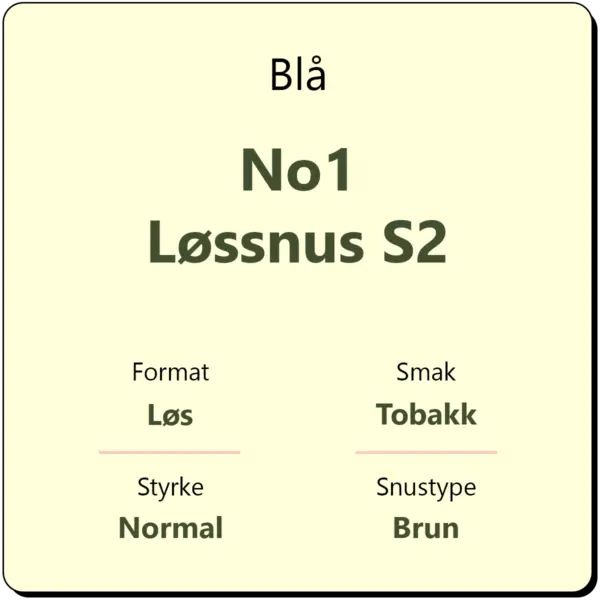 Blå No1 Løssnus S2 er Blå sin originale løssnus. Snusen har en balansert smak av tradisjonell mørk tobakk og er fuktig ved berøring. Blå No1 har et nikotininnhold på 8 mg/g, en relativt normal styrkegrad for løssnus. Løssnusen har en lang historie som fører helt tilbake til 1822.