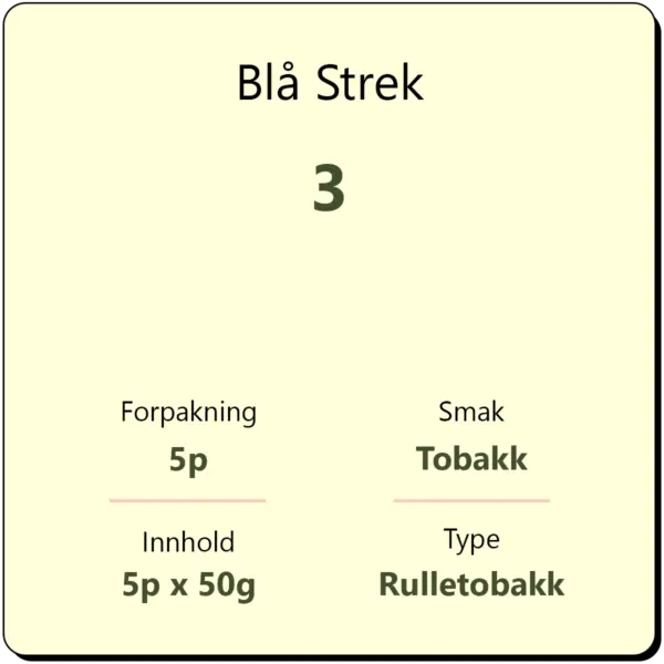 Blå Strek 3 5p inneholder 5 pakker med rulletobakk fra produsent Conrad Langaard. Dette er en fyldig og rund rulletobakk som inneholder både Burley og Virginia tobakk.