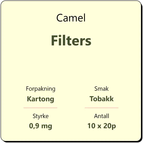 Camel Filter kartong består av 10 sigarettpakker med 20 sigaretter i hver pakke. Dette er en klassisk sigarett med filter fra Camel.