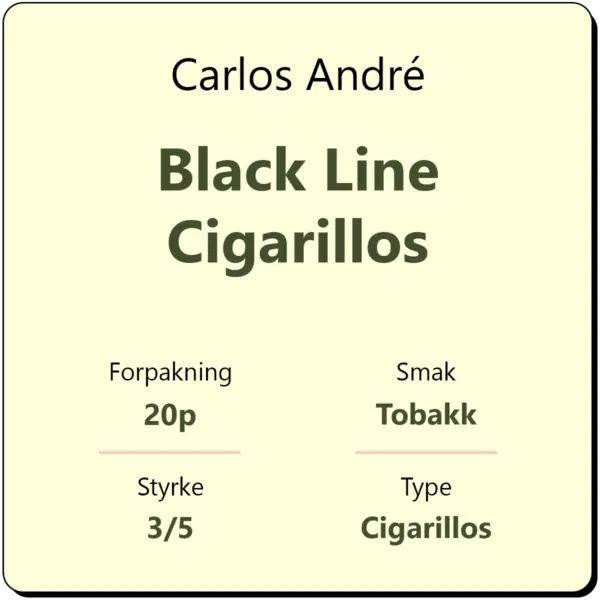 Carlos André Black Line Cigarillos 20p består av tobakk fra Mellom- og Sør-Amerika samt Sørøst-Asia og er pakket med en Connecticut-wrapper fra Ecuador. Smaksbildet viser lett krydderpreg og subtil sødme.