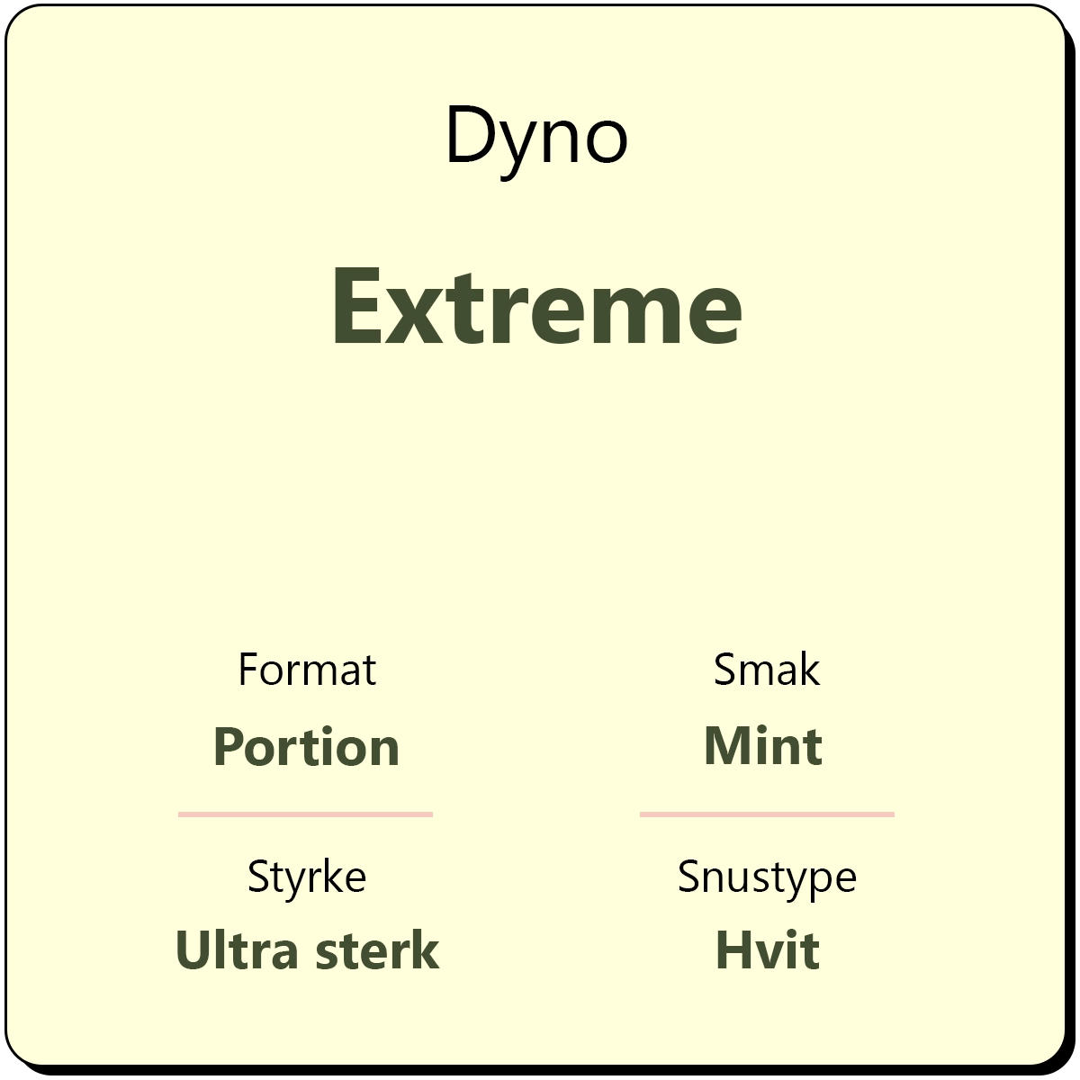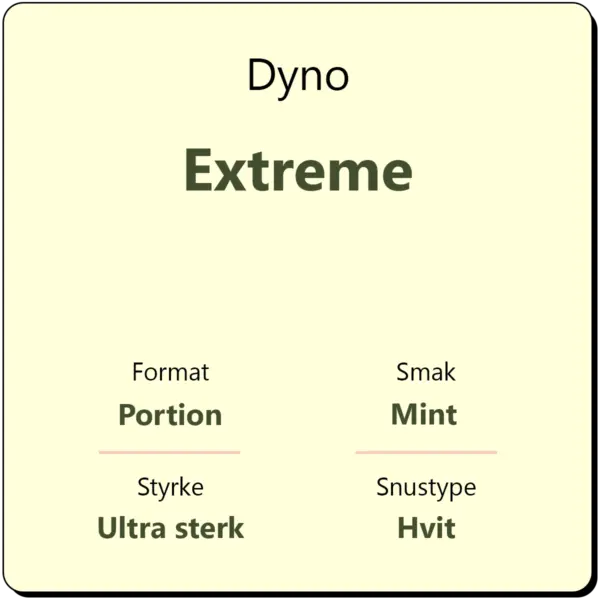 Dyno Extreme er en snus med et svært høyt styrkenivå på 28 mg/g nikotin, tilsvarende en ultra sterk snus. Dyno Extreme byr på tradisjonell tobakk med noter av mint for en kjølende og intens smaksopplevelse. Dyno Extreme kommer i hvite porsjonsposer, noe som gjør at den renner mindre enn original brun snus. Den hvite porsjonsposen reduserer også sjansen for misfarging av tennene, og gir en langvarig smak som fyller munnen over lang tid.