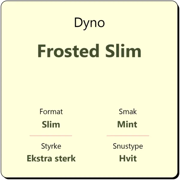 Dyno Frosted Slim er en ekstra sterk snus med smak av klassisk mint. Snusen kommer i tørre hvite porsjonsposer i et slim porsjonsformat. Dyno Frosted karakteriseres som en ekstra sterk snus med sitt nikotininnhold på 16 milligram nikotin per gram, tilsvarende styrkegrad S4. Det er ca. 25 porsjonsposer i hver boks.