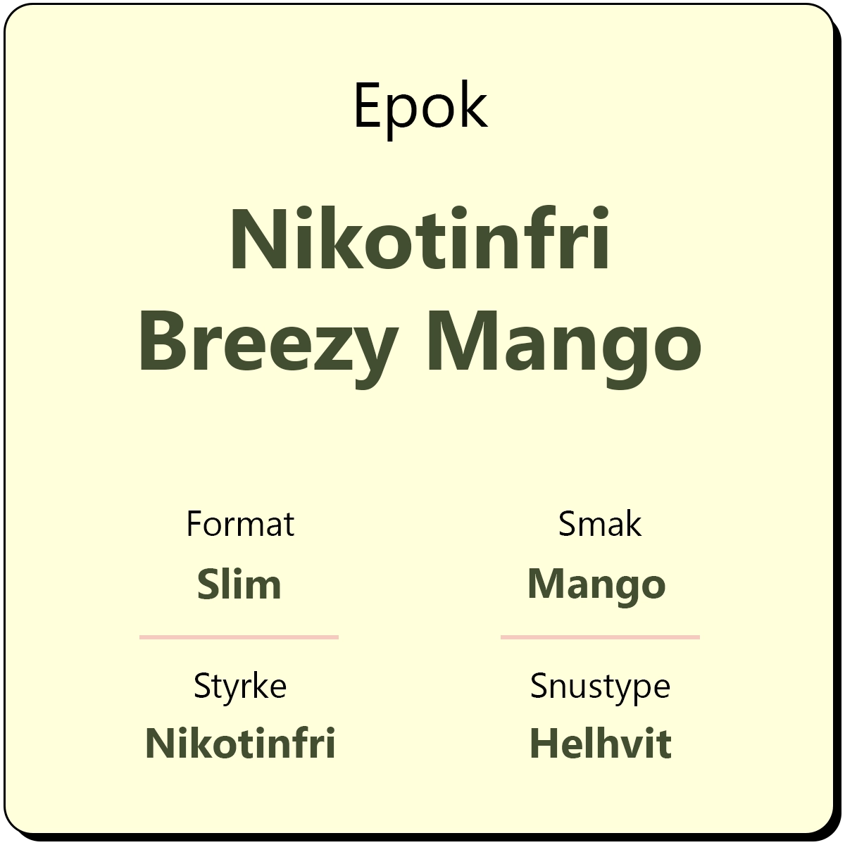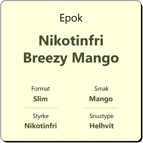 Epok Nikotinfri Breezy Mango er en del av Epok sitt stadig økende sortiment av nikotinfri snus. Denne varianten kjennetegnes av sin sødmefulle, tropiske smak. Snus med smak av mango er etterhvert blitt mer vanlig. Det er derimot ikke like ofte man får nikotinfri snus med denne smaken. Hver boks inneholder ca. 22 porsjoner.