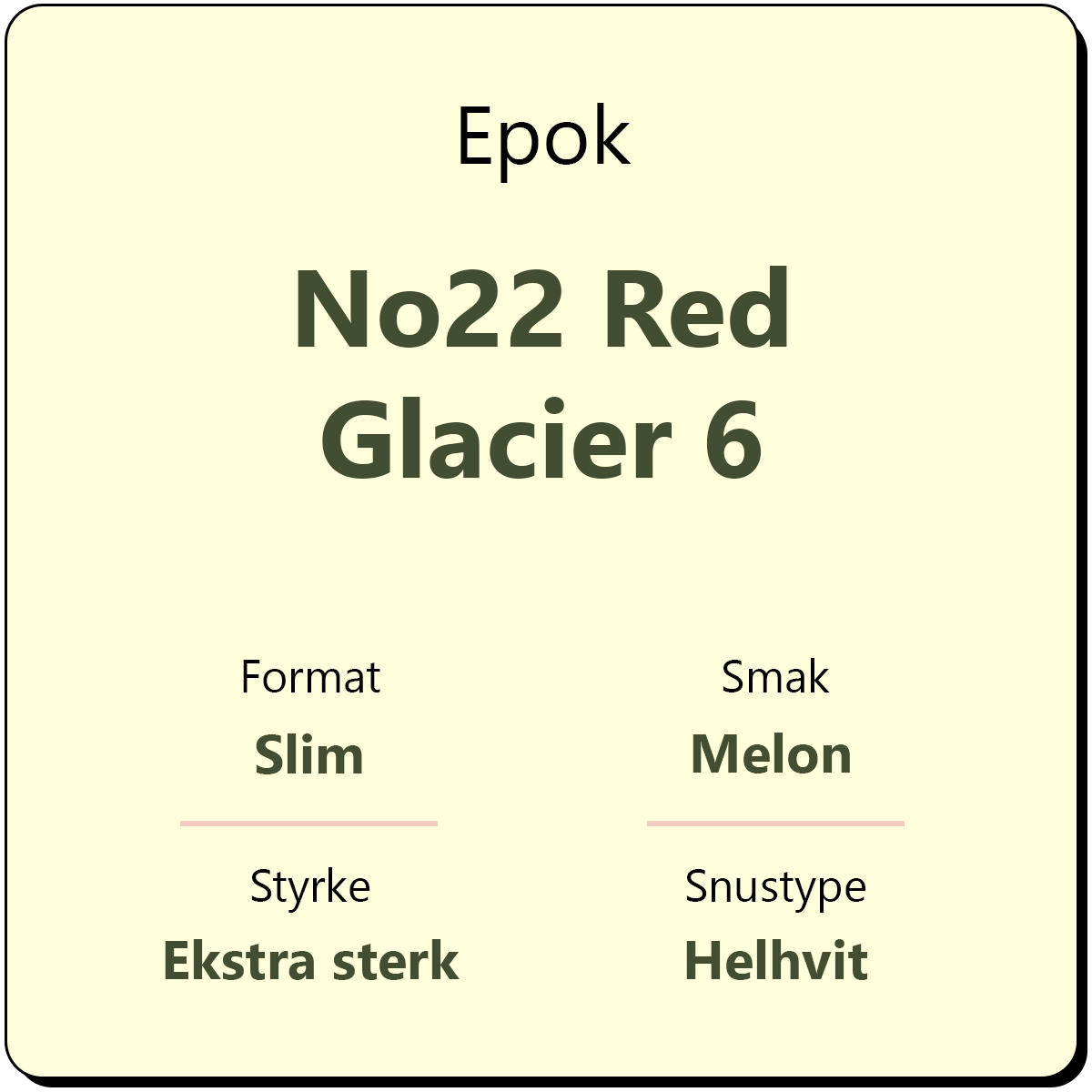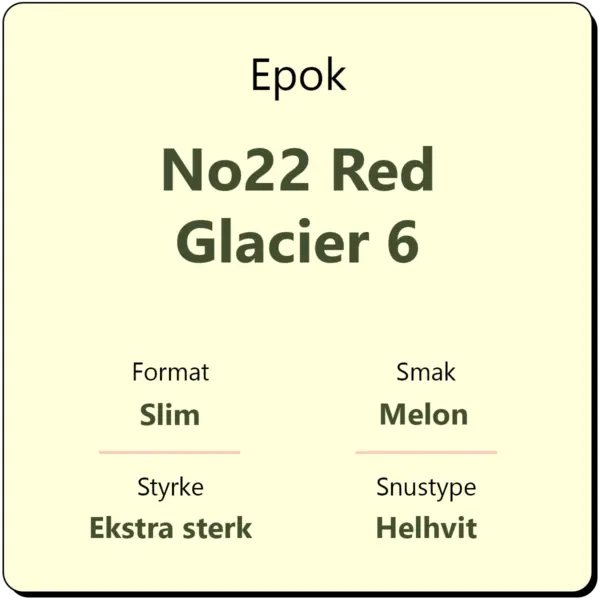Epok No 22 Red Glacier 6 er en snus fra Epok med et nikotininnhold på 20 mg/g. Red Glacier har en merkbar smak av melon med innslag av mint. Epok er kjent for å være den første produsenten på markedet med helhvit snus. Hver boks med Epok No 22 Red Glacier 6 inneholder omtrent 24 porsjonsposer.