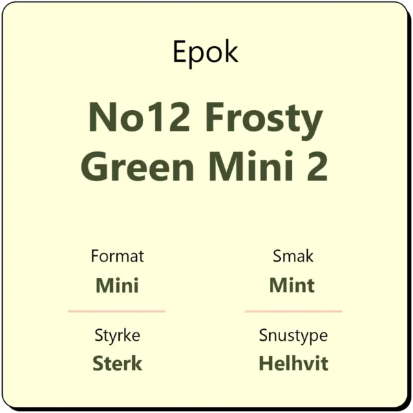 Epok No12 Frosty Green Mini 2 er en helhvit snus fra Epok i mini porsjonsformat. Frosty Green Mini byr på en mild smak av mint og et nikotininnhold på 12 mg/g, tilsvarende en sterk snus. På lik linje med andre varianter fra Epok, kommer også Frosty Green i helhvite porsjonsposer. Hver boks inneholder omtrent 30 porsjonsposer.