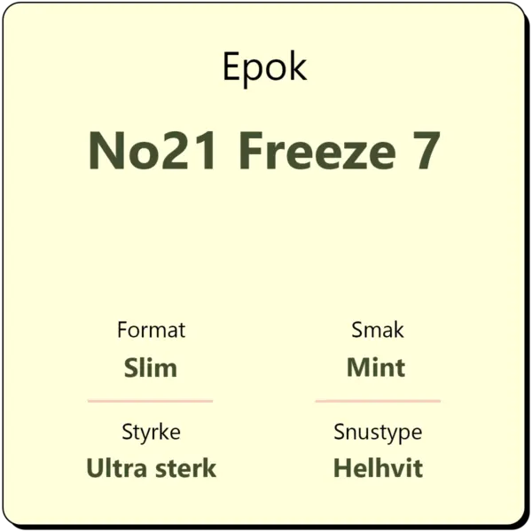 Epok No21 Freeze 7 er en ultra sterk snus i helhvit slim porsjon. Epok Freeze har en langvarig og intens smak av mint med aroma fra peppermynte. Epok Freeze er en av de sterkeste variantene fra Epok med et nikotininnhold på 23,3 mg/g. På lik linje med andre varianter fra Epok, kommer også Freeze i helhvit porsjon.