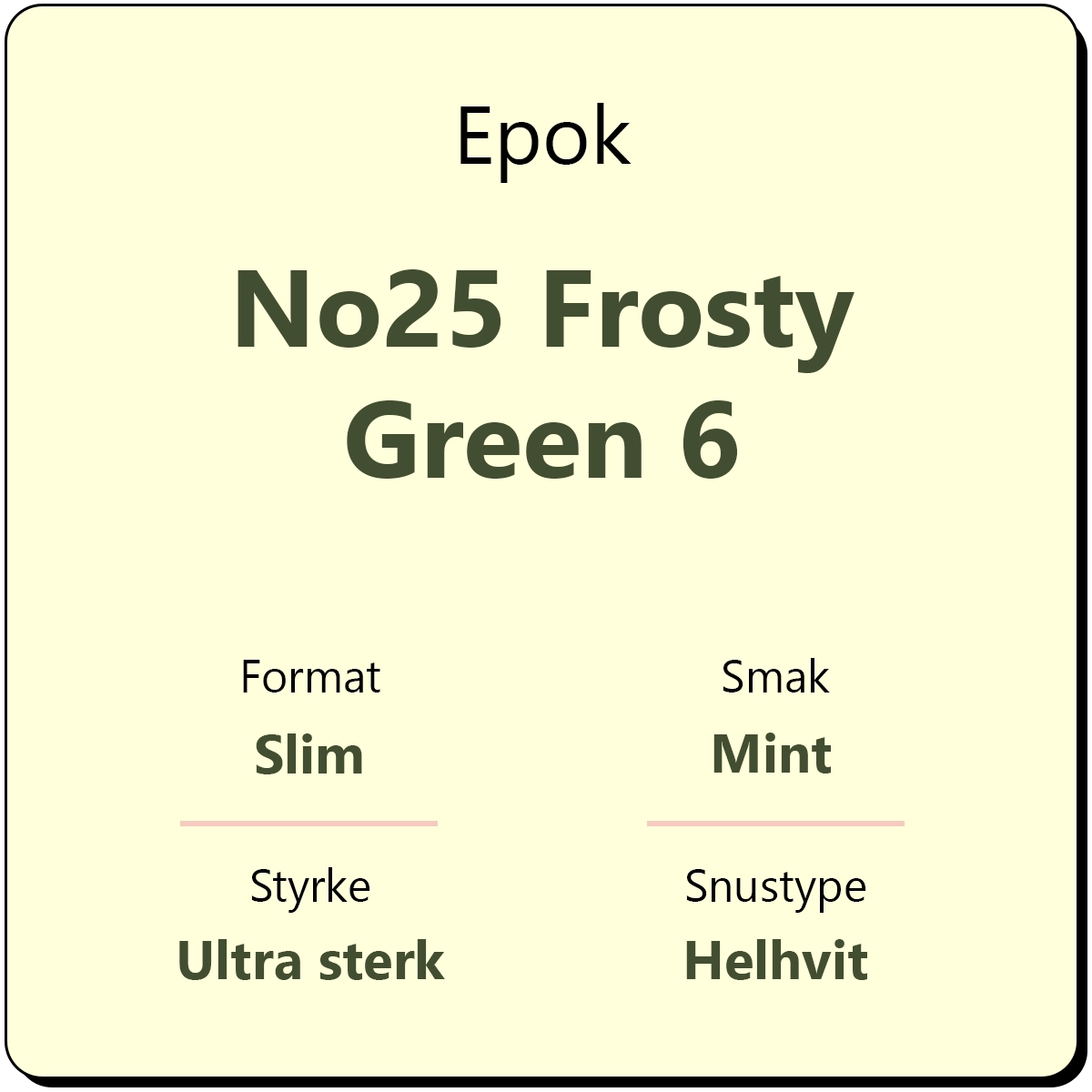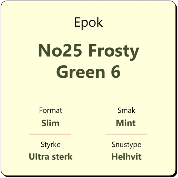 Epok No25 Frosty Green 6 er en ultra sterk snus med smak av peppermynte. På lik linje med andre produkter fra Epok, kommer også Epok No25 Frosty Green 6 i helhvite slim porsjonsposer. Hver boks inneholder ca. 24 porsjonsposer med 20 mg/g i nikotininnhold.