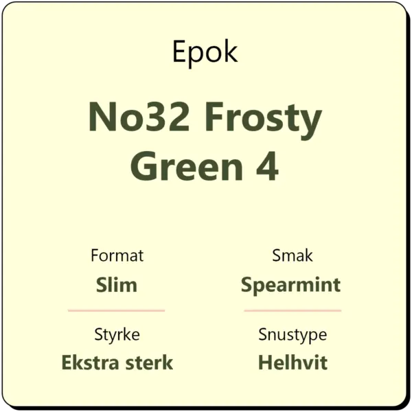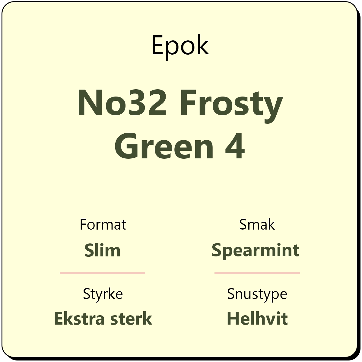 Epok No32 Frosty Green 4 er en ekstra sterk snus med smak av spearmint og mint. Dette er den samme smaksvarianten som Epok No25, men nedjustert i styrke. På lik linje med andre produkter fra Epok, kommer også Epok No32 i helhvite slim porsjonsposer. Hver boks inneholder ca. 22 porsjonsposer med 14 mg/g i nikotininnhold.