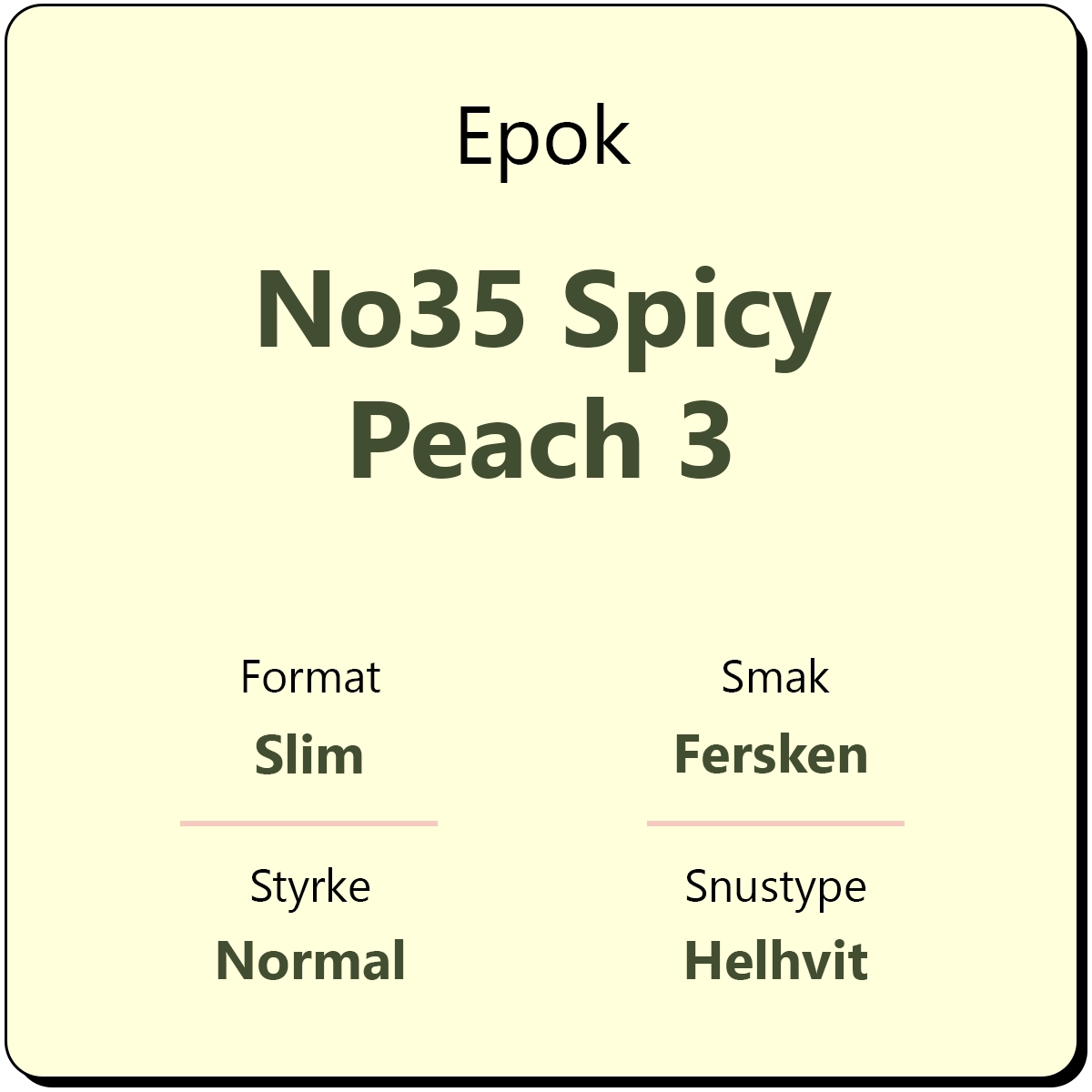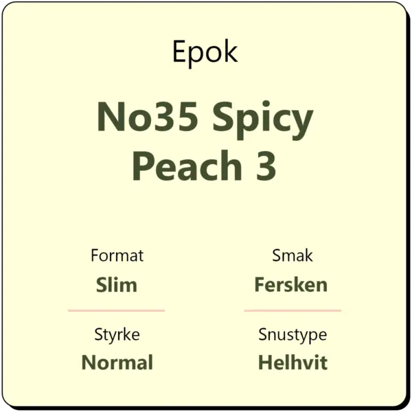 Epok No35 Spicy Peach 3 er en helhvit snus med en spennende smakskombinasjon av saftig fersken og et hint av krydder. Epok er kjent for sin avanserte produksjonsteknologi som renser brun tobakk. Dette resulterer i et hvitt sluttprodukt med en renere og mer behagelig opplevelse.