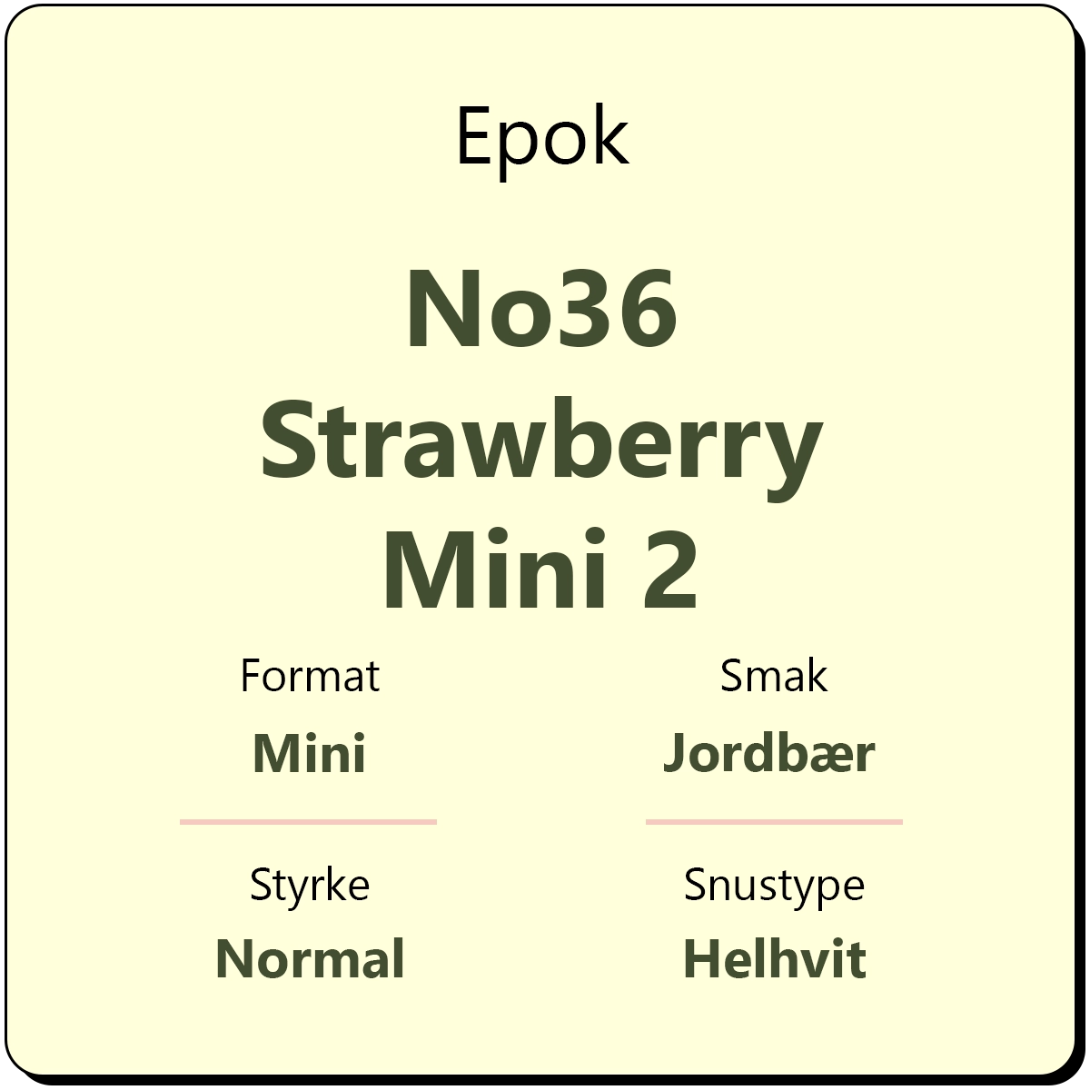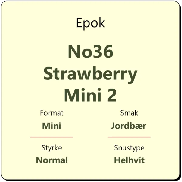 Epok No36 Strawberry Mini 2 er en helhvit snus fra Epok i mini porsjonsformat. Strawberry Mini 2 byr på en fruktig smakskombinasjon med jordbær og mint. Den har et nikotininnhold på 8 mg/g, tilsvarende en snus med normal styrke.