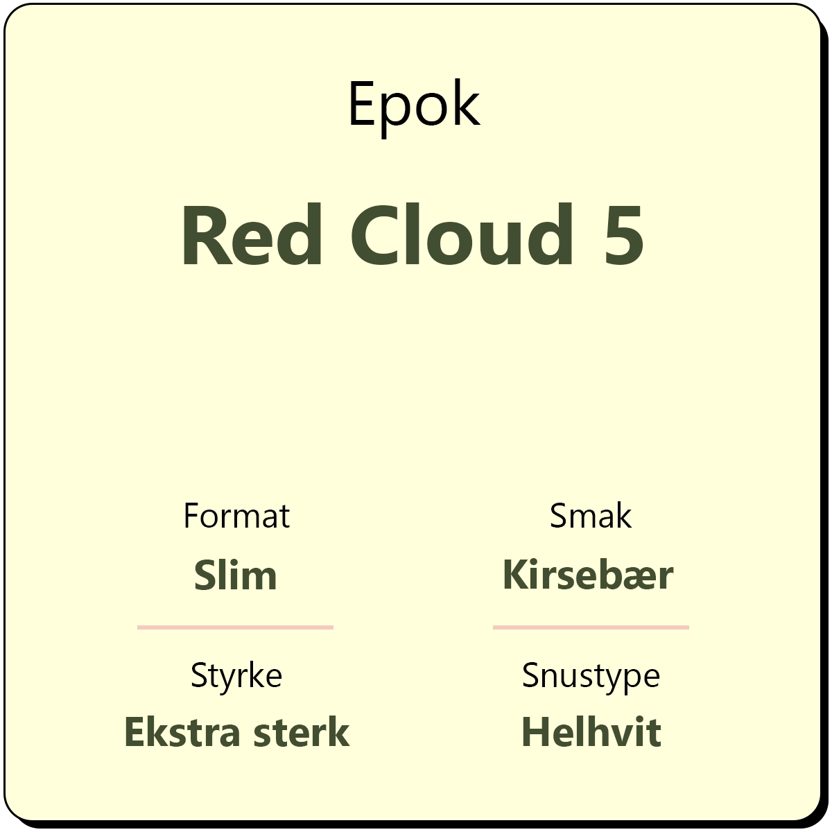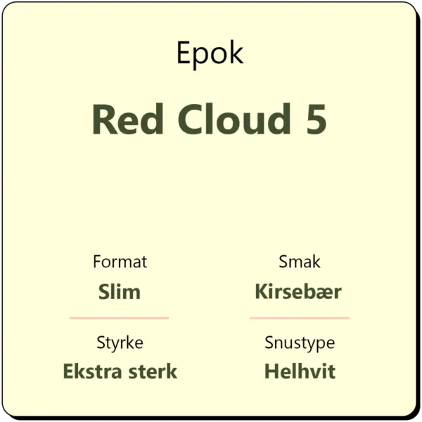 Epok Red Cloud 5 er en ekstra sterk snus i helhvit slim porsjon. Epok Red Cloud byr på en langvarig og intens smak av søt kirsebær. Snusen er en av de sterkere variantene fra Epok med et nikotininnhold på 16 mg/g.