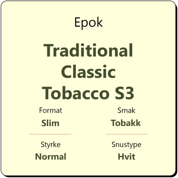 Denne hvite snusen er laget med fokus på kvalitet og smaksbalanse, i tråd med Epoks standarder. Epok Traditional-serien representerer et nytt kapittel for merket, med klassisk hvit snus inspirert av tradisjonelle smaker.