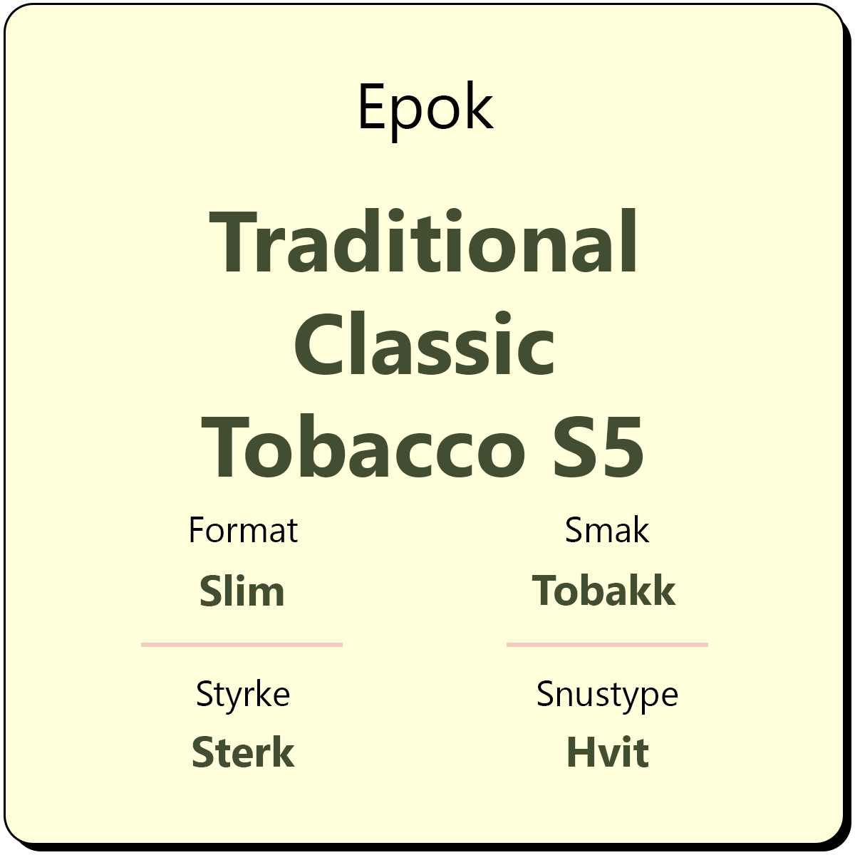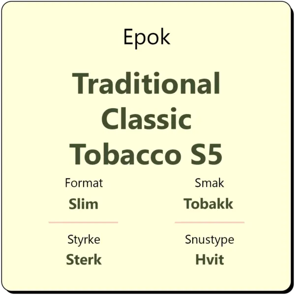 Epok Traditional Classic Tobacco Slim S5 leverer en autentisk snusopplevelse med tydelig tobakkskarakter og et hint av bergamott. Den rene smaken og det velkjente preg av sitrus gir en tradisjonell og rund opplevelse. Snusen kommer i slim-format og er tilpasset komfortabel og diskret bruk.