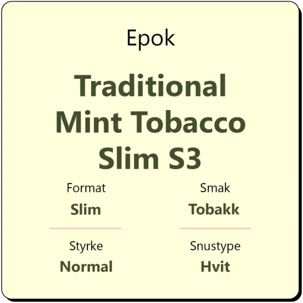 Epok Traditional Mint Tobacco Slim S3 er en snusvariant som kombinerer en myk tobakkskarakter med kjølig mint. Den har en balansert smak og er utviklet for deg som ønsker en mild, men oppfriskende opplevelse. Slim-formatet gir en diskré og komfortabel passform.