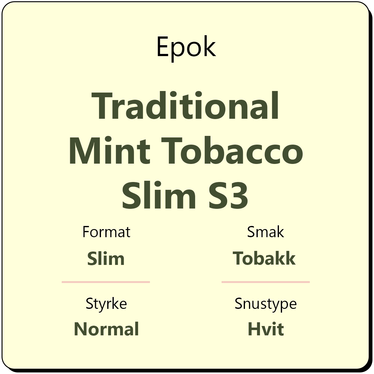 Denne varianten inngår i Epoks Traditional-serie, deres første satsning på klassiske smaker i hvit snus.