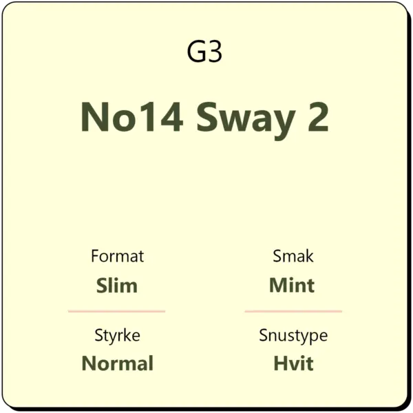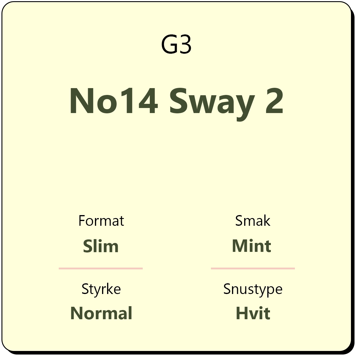 G3 No14 Sway 2 er en hvit snus i slim porsjon. G3 No14 byr på en tradisjonell smak av mint og tobakk. Med et nikotininnhold på 12 mg/g er Sway 2 en normalt sterk snus. Hver boks inneholder ca. 24 porsjonsposer.
