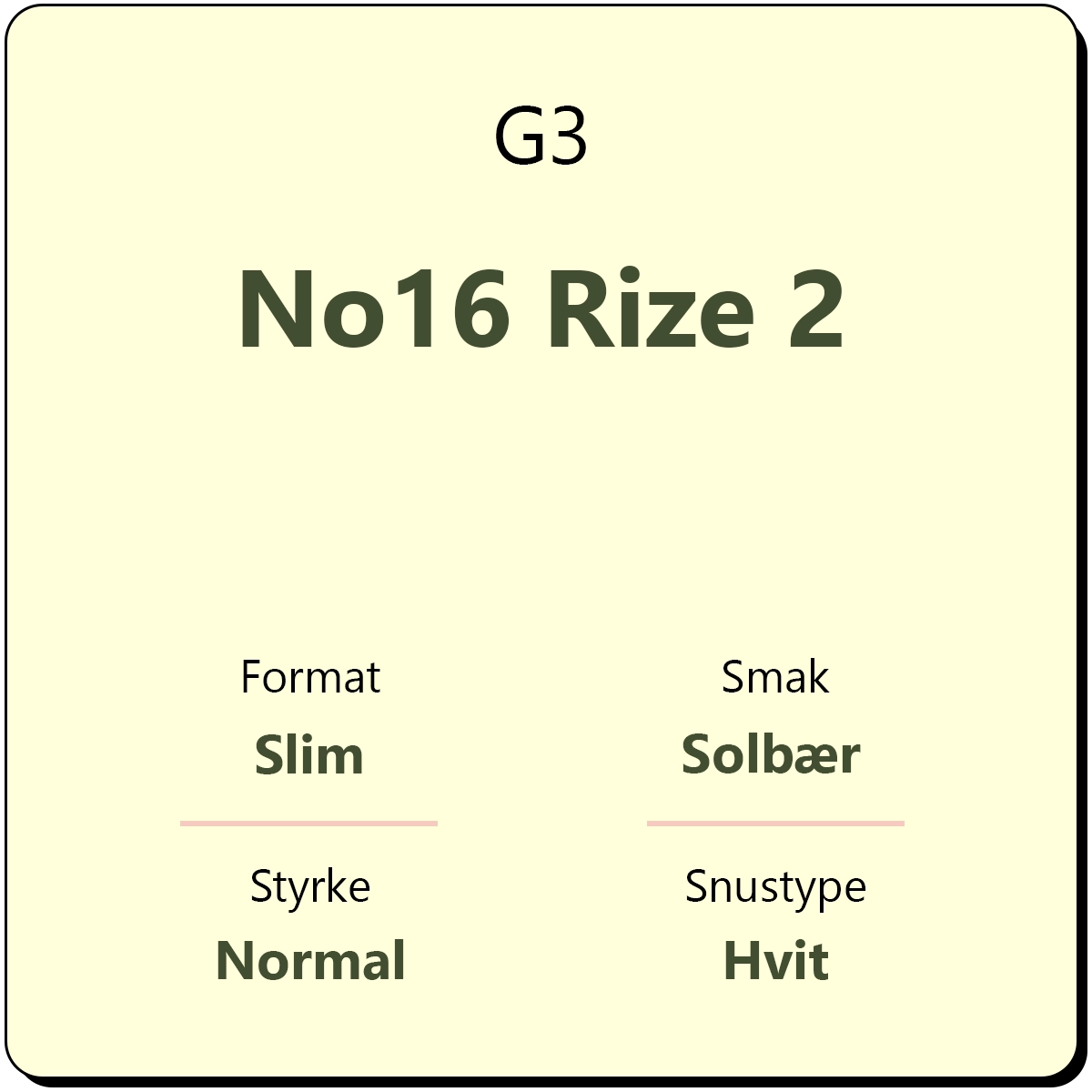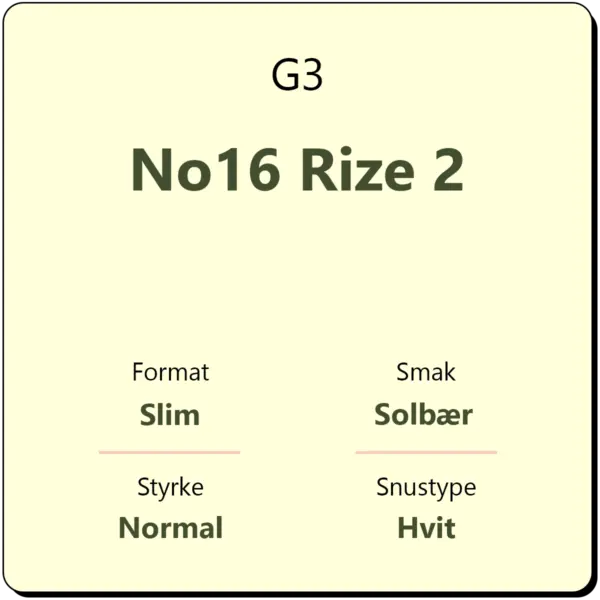 G3 No16 Rize 2 er en hvit snus i slim porsjon. G3 No16 byr på en smak av solbær og rødt eple. Med et nikotininnhold på 12 mg/g er Rize 2 en normalt sterk snus. Hver boks inneholder ca. 24 porsjonsposer.