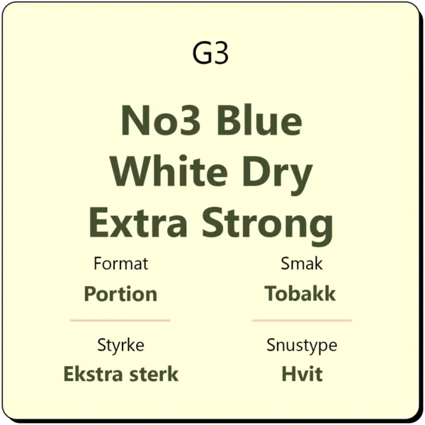 G3 No3 Blue White Dry Extra Strong er en ekstra sterk snus med smak av tobakk og et tydelig innslag av peppermynte. G3 No3 Blue er en klassisk original snus i hvite porsjonsposer. Hver boks med G3 Blue White inneholder ca. 24 porsjonsposer.