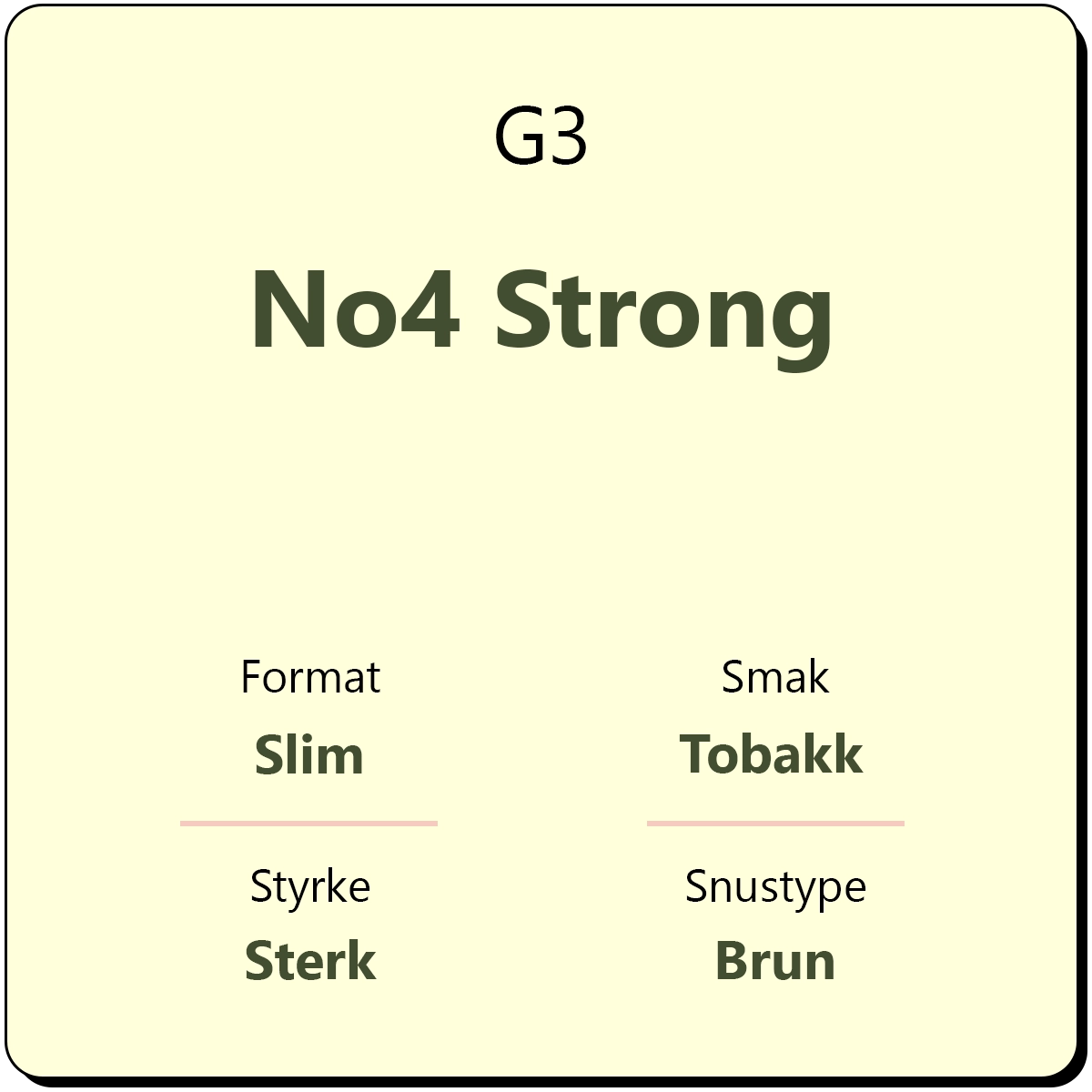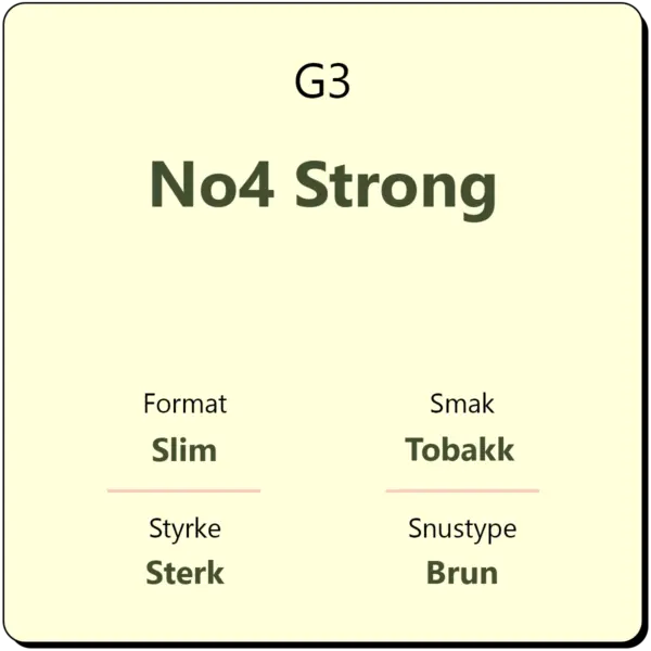 G3 No4 Strong er en brun snus fra G3 med smak av tobakk og bergamott med undertoner av lær, te og høy. Dette er en sterk snus med 15 mg/g nikotin i slim porsjon. Hver boks inneholder ca. 24 porsjonsposer.