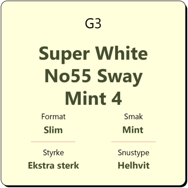 G3 Super White No55 Sway Mint 4 er en helhvit snus med en frisk smak av mint. G3 er kjent for sine innovative produkter som kombinerer høy kvalitet med moderne smaksprofiler. Denne varianten gir en ren og hvit pose som ikke misfarger tennene.