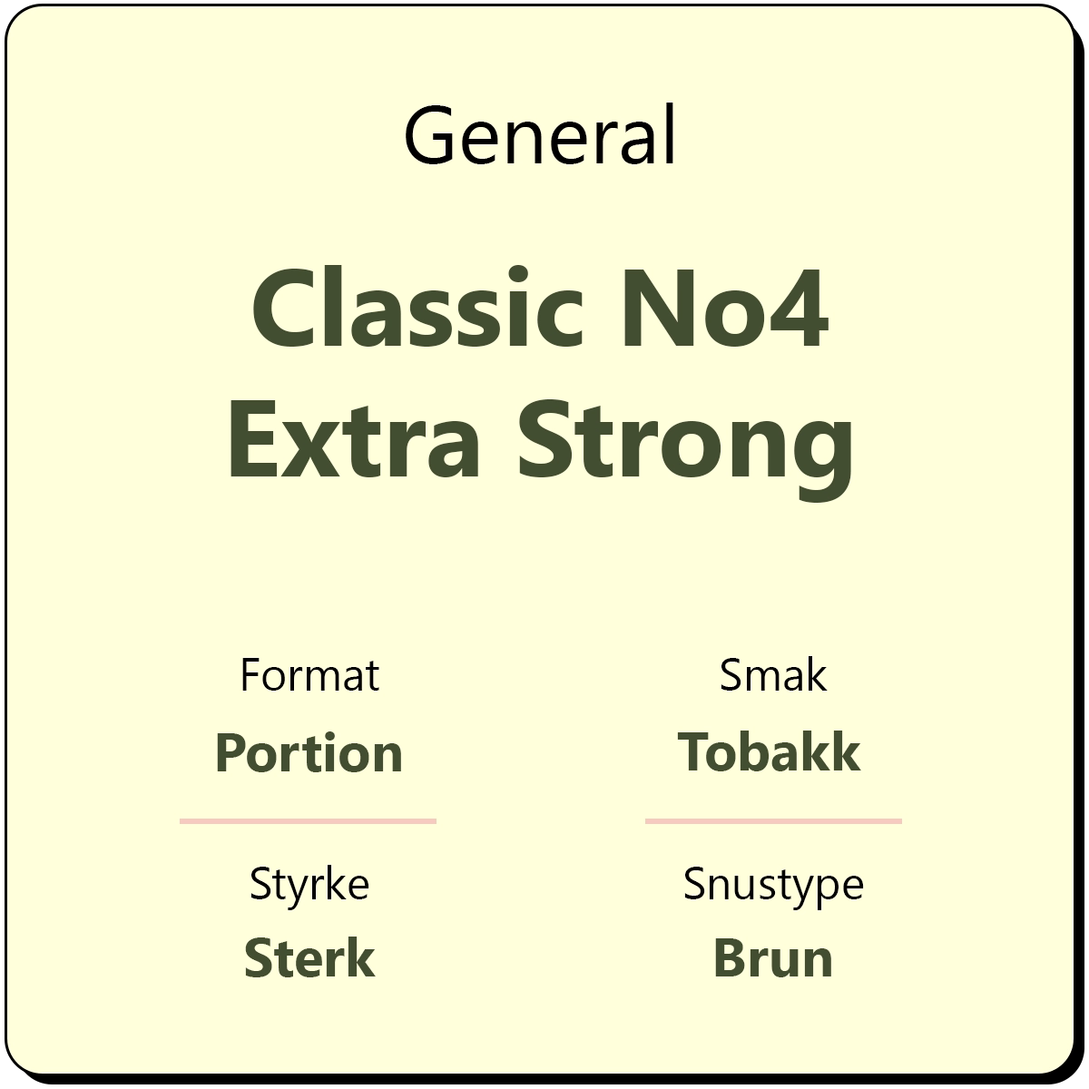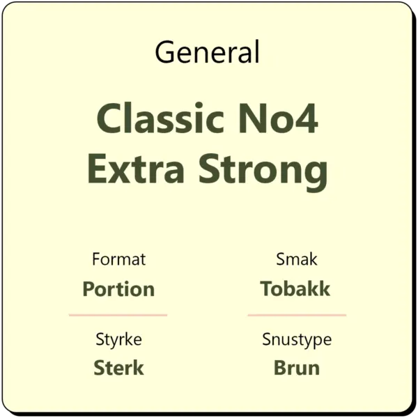 General Classic No4 Extra Strong er en sterk snus i original brun porsjon. Den har et nikotininnhold på 14 mg/g og er en sterkere variant av Classic No3 Portion. General Classic No4 har en smak av tobakk med innslag av syrlig bergamott av høy kvalitet. Hver boks inneholder ca. 24 porsjonsposer.