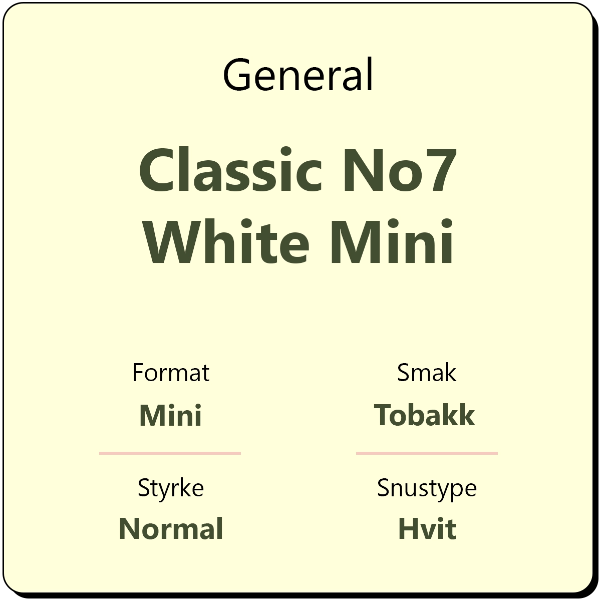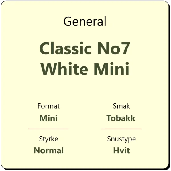General Classic No7 White Mini er en snus i mini-format fra General med 8 mg/g nikotin. Snusen smaker av krydret tobakk og et hint av både bergamott, te, høy og lær. Mini snus er en variant med porsjonsposer som er mindre enn vanlige porsjoner. Det er ca. 20 mini porsjoner i hver boks.