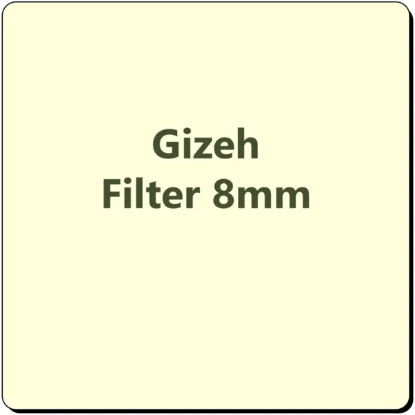 Gizeh Filter 8mm er et filter for rulling av sigaretter fra det kjente tyske merket Gizeh. Gizeh har også lagt til en stripe med lim, farget med konditorfarge, for å gjøre det mer oversiktlig når man ruller sigaretten. Pakken inneholder 100 stk. filter i en solid pappeske med en praktisk åpningsmekanisme. Hvert filter har en lengde på 15 mm.