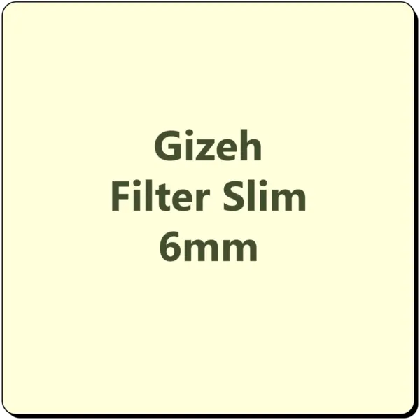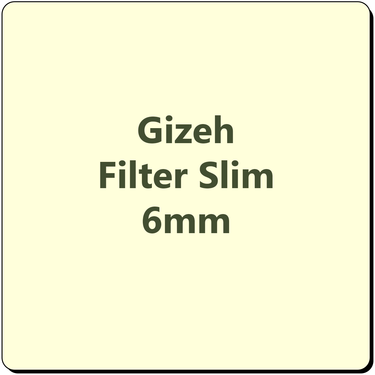 Gizeh Filter Slim 6mm er et filter for rulling av sigaretter fra det kjente tyske merket Gizeh. Gizeh har også lagt til en stripe med lim, farget med konditorfarge, for å gjøre det mer oversiktlig når man ruller sigaretten. Pakken inneholder 120 stk. filter. Filteret har en lengde på 15 mm.