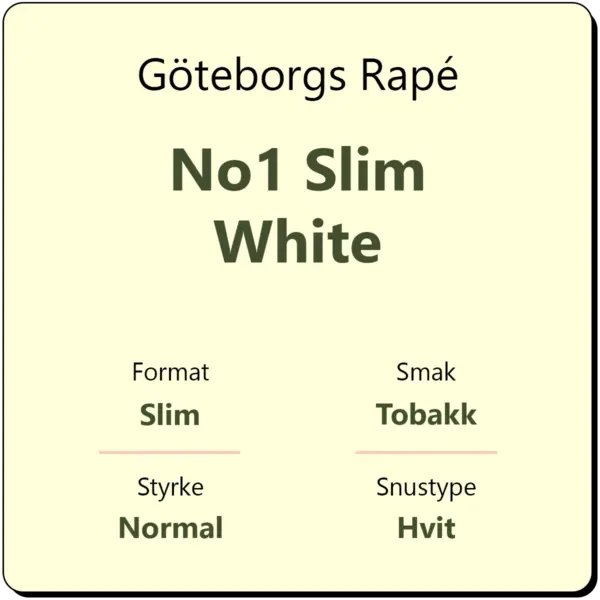 Göteborgs Rapé No1 Slim White Portion er en hvit snus i slim porsjon med en svært mild smak av tobakk. I tillegg har Göteborgs Rapé tydelige innslag av både einer og lavendel, samt et lite hint av sitrus. Snusen har eksistert siden 1919 og er i dag produsert av Swedish Match. Göteborgs Rapé har et styrkenivå på 8,5 mg/g og klassifiseres med styrken normal.