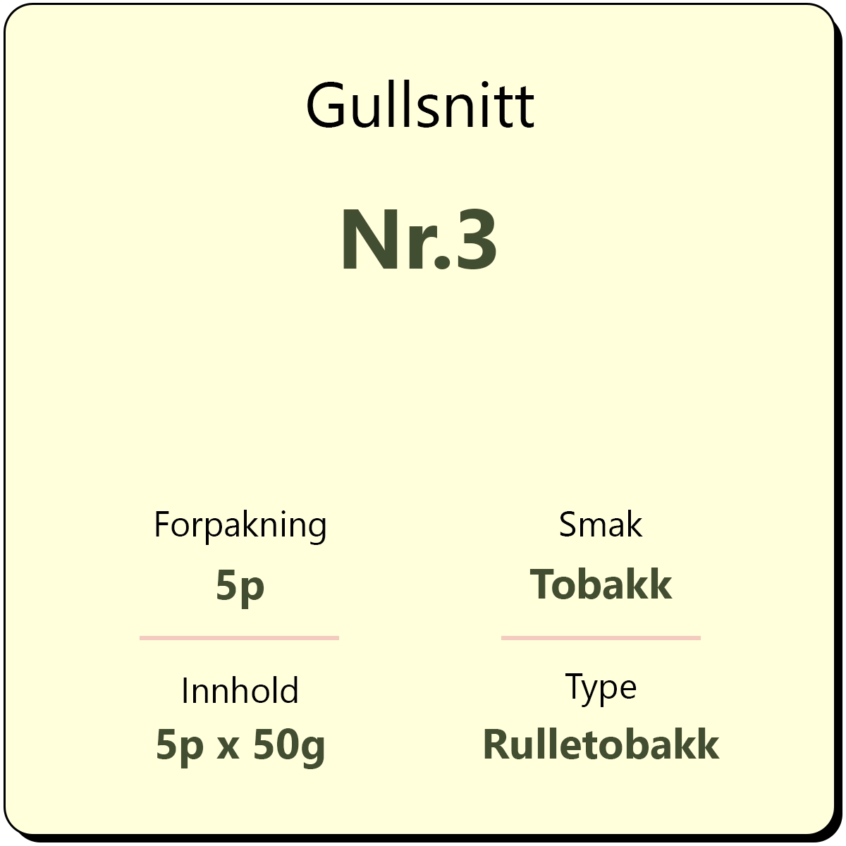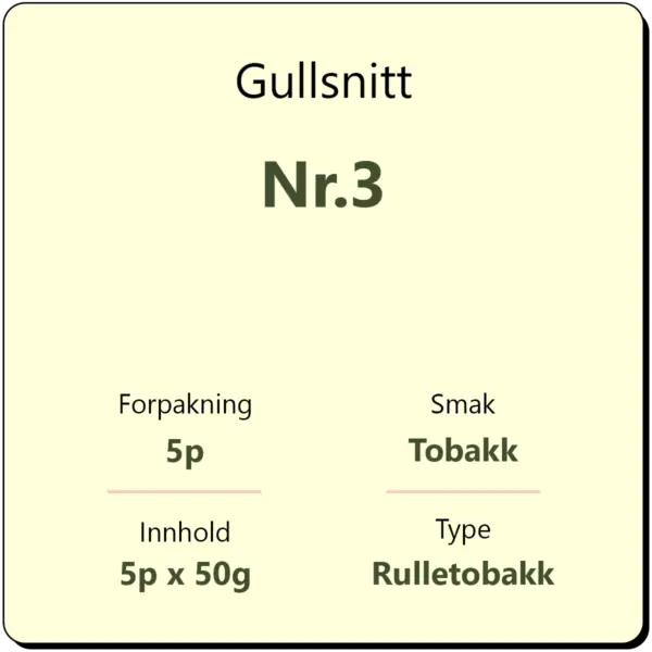 Gullsnitt Nr.3 5p er en aromatisk rulletobakk fra produsent Conrad Langaard. Én pakning inneholder 5 pakker med tobakk à 50 gram, totalt 250 gram tobakk.
