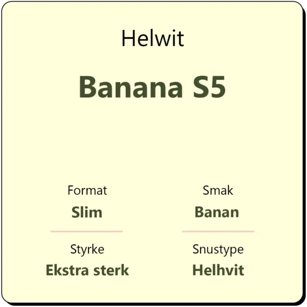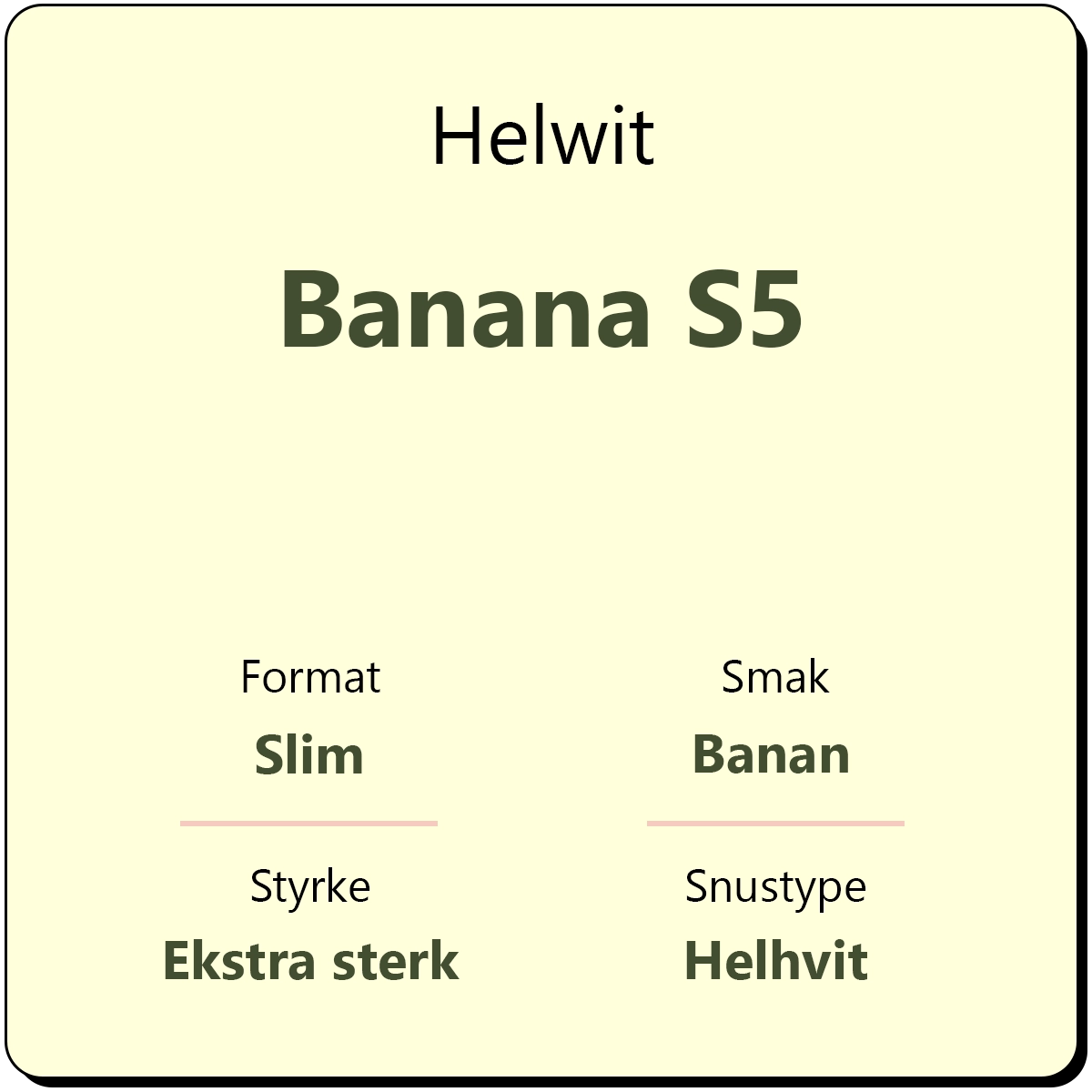 Helwit Banana S5 er en helhvit snus med smak av banan. Dette er en ekstra sterk snus i et slim porsjonsformat fra den svenske produsenten Yoik AB.