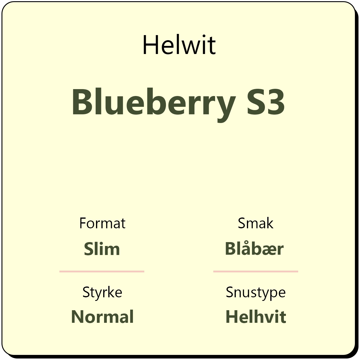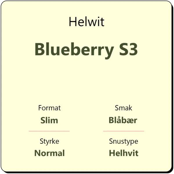 Helwit Blueberry S3 byr på smak av blåbær rett fra skogen. Den helhvite snusen fra Sverige har et nikotininnhold på kun 9 mg/g, noe som gjør det til en mild snus med normal styrke. Helwit har karakterisert denne snusen til styrkegrad S3. Hver boks inneholder ca. 30 porsjonsposer.
