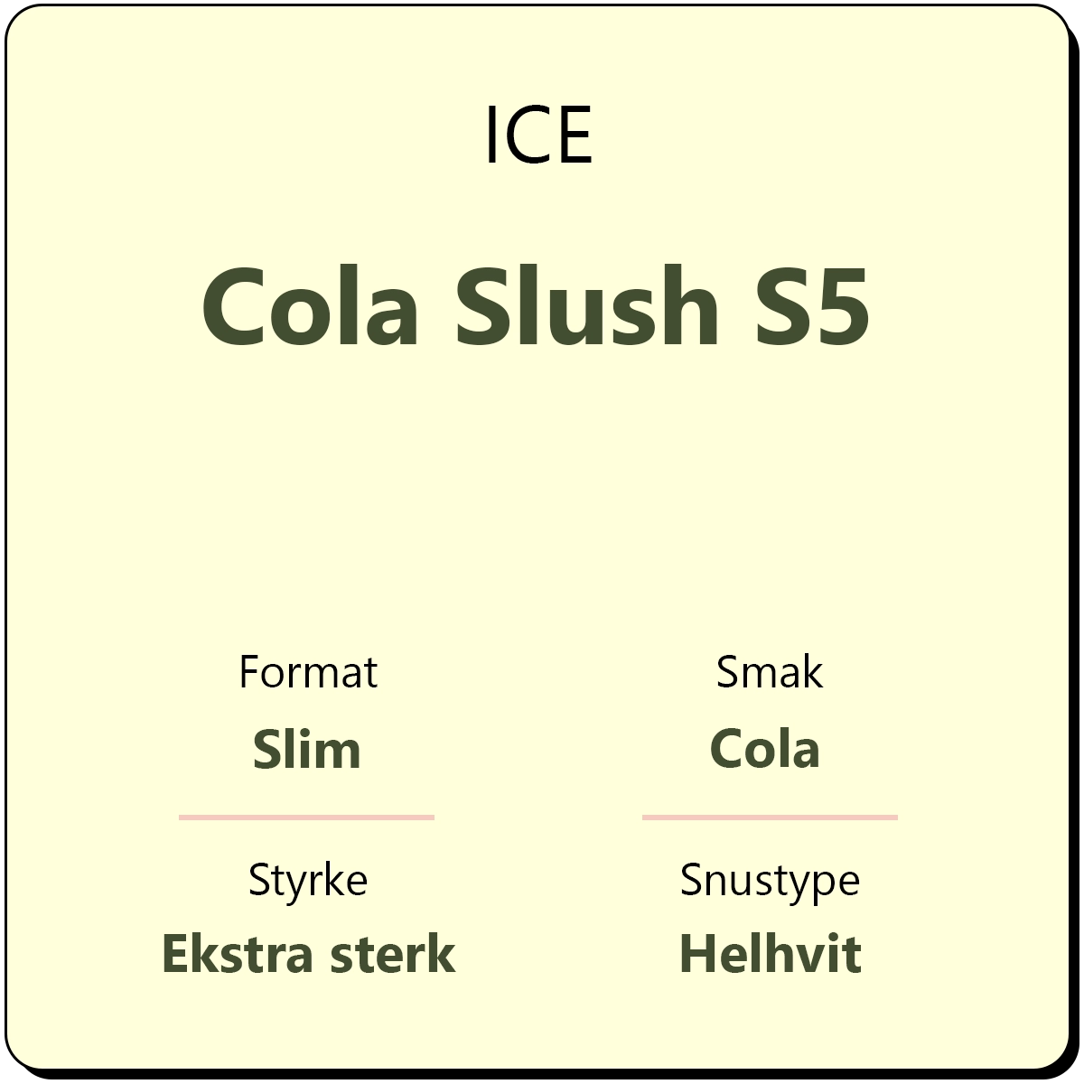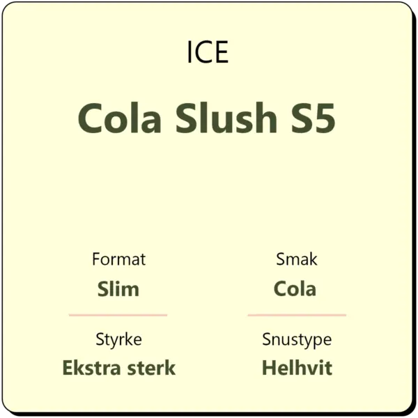 ICE Cola Slush S5 er en helhvit snus med en klassisk smak av sødmefull cola med en kjølende effekt. ICE Cola Slush produseres av Nordic Brandbase. Denne snusen inneholder 16,5 mg nikotin per gram, og anses dermed som en ekstra sterk snus. Hver boks inneholder ca. 24 porsjoner, og én boks veier 15 gram.