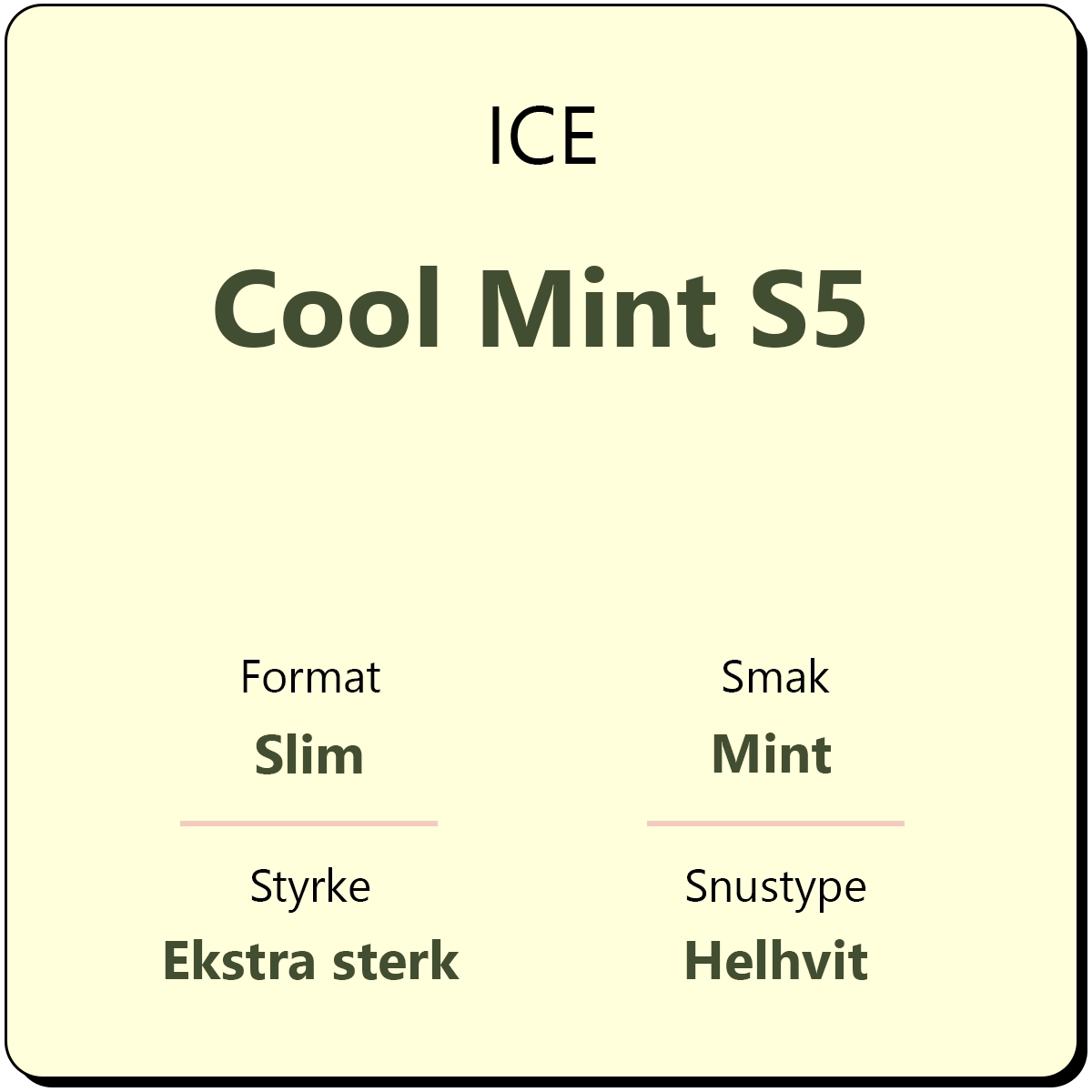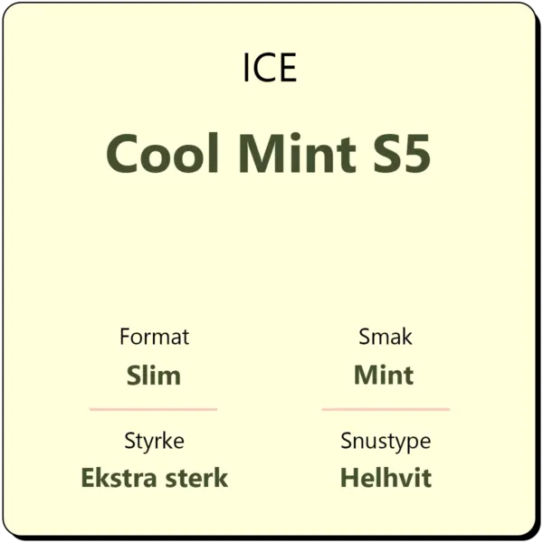 ICE Cool Mint S5 er en helhvit snus med smak av klassisk mint, en smak som varer. ICE Cool Mint produseres av Nordic Brandbase. Denne snusen inneholder 16,5 mg nikotin per gram, og anses dermed som en ekstra sterk snus. Hver boks inneholder ca. 24 porsjoner, og én boks veier 15 gram.