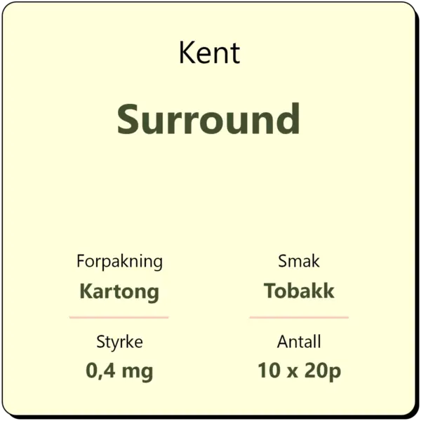 Kent Surround består av 10 sigarettpakker med 20 sigaretter i hver pakke. Dette er en klassisk sigarett med filter fra Kent. Kent Surround har et nikotininnhold på 0,4mg. Dette er nokså lavt sammenlignet med andre sigaretter, men mer enn den mildere varianten White.