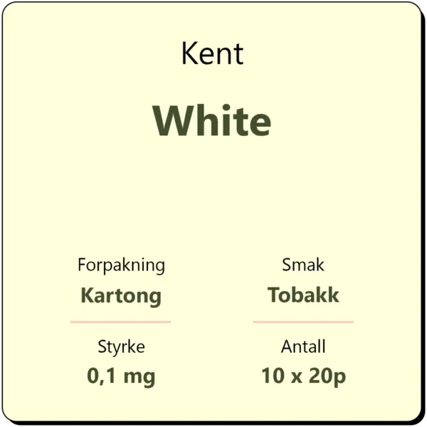Kent White består av 10 sigarettpakker med 20 sigaretter i hver pakke. Dette er en klassisk sigarett med filter fra sigarettmerket Kent. Filteret i sigaretten er et micronite-filter. Dette ble opprinnelig utviklet for å filtrere ut mer skadelige stoffer og gi en renere røykeopplevelse. White kjennetegnes av sitt lave innhold av tjære og nikotin, sammenlignet med andre sigaretter.