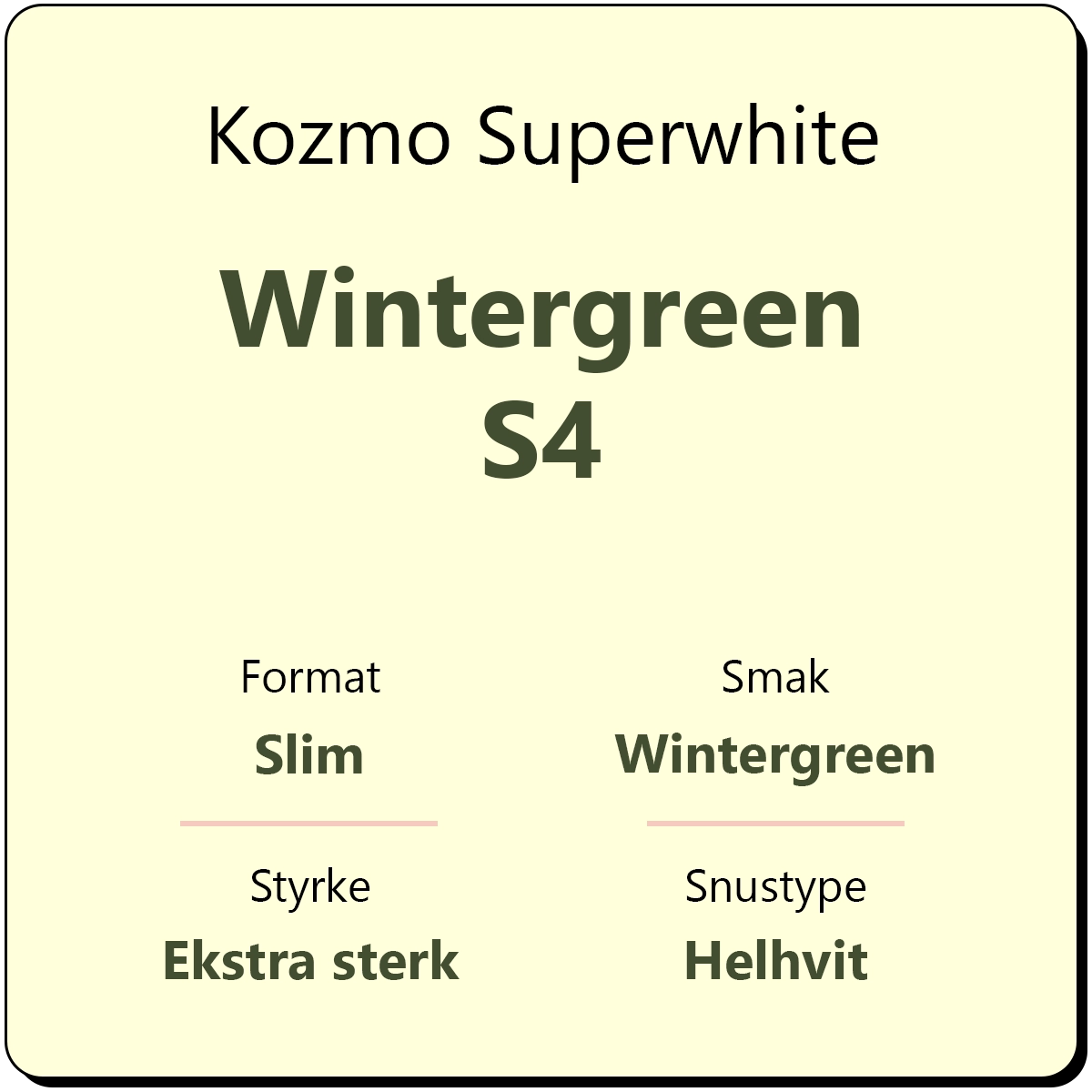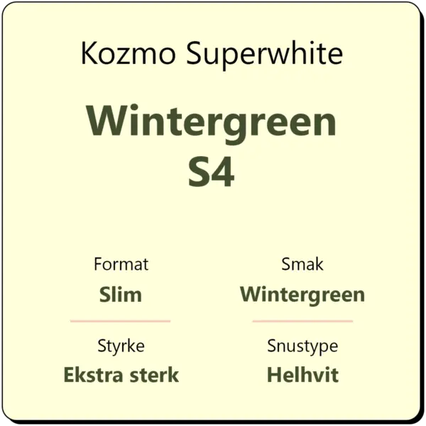 Kozmo Superwhite Wintergreen S4 er en porsjonssnus med smak av wintergreen. Snusen er en ekstra sterk snus med 15 mg/g nikotin, karakterisert med styrkegrad S4 av produsenten Dholakia Tobacco. Alle varianter fra Kozmo Superwhite kommer i et helhvitt, slim porsjonsformat, for en diskré og behagelig snusopplevelse.