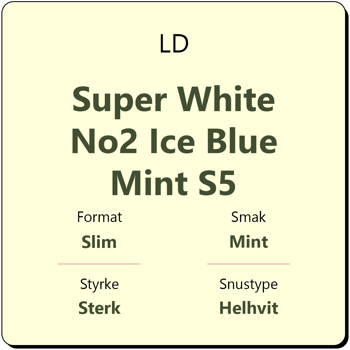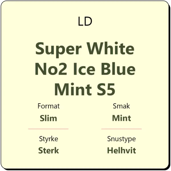 LD Super White No2 Ice Blue Mint S5 er en helhvit snus med en frisk og kjølende mintsmak. LD er kjent for å produsere snus av høy kvalitet, med en tydelig smak og en jevn nikotinfrigjøring. Da porsjonsposen er hvit, etterlater den ingen misfarging på tennene og gir en ren opplevelse.