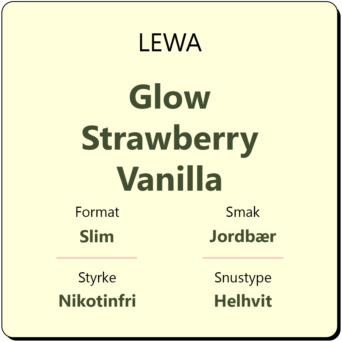 LEWA Glow Strawberry Vanilla er en helhvit porsjonssnus i et diskret slim-format. Den byr på en smakskombinasjon av jordbær og vanilje. For å gi deg ekstra energi, inneholder hver porsjon 10 mg koffein, i tillegg til gunstige ingredienser som Dracobelle™, magnesium, zink. En boks gir deg omtrent 18 porsjonsposer.