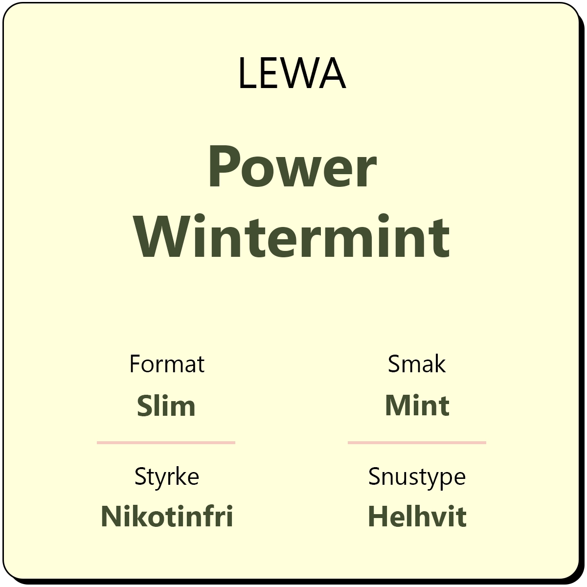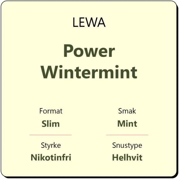 LEWA Power Wintermint er en helhvit porsjonssnus i et diskret slim-format. Den byr på en smakskombinasjon av mint. For å gi deg ekstra energi, inneholder hver porsjon 50 mg koffein, i tillegg til gunstige ingredienser som taurin, zink, magnesium. En boks gir deg omtrent 18 porsjonsposer.
