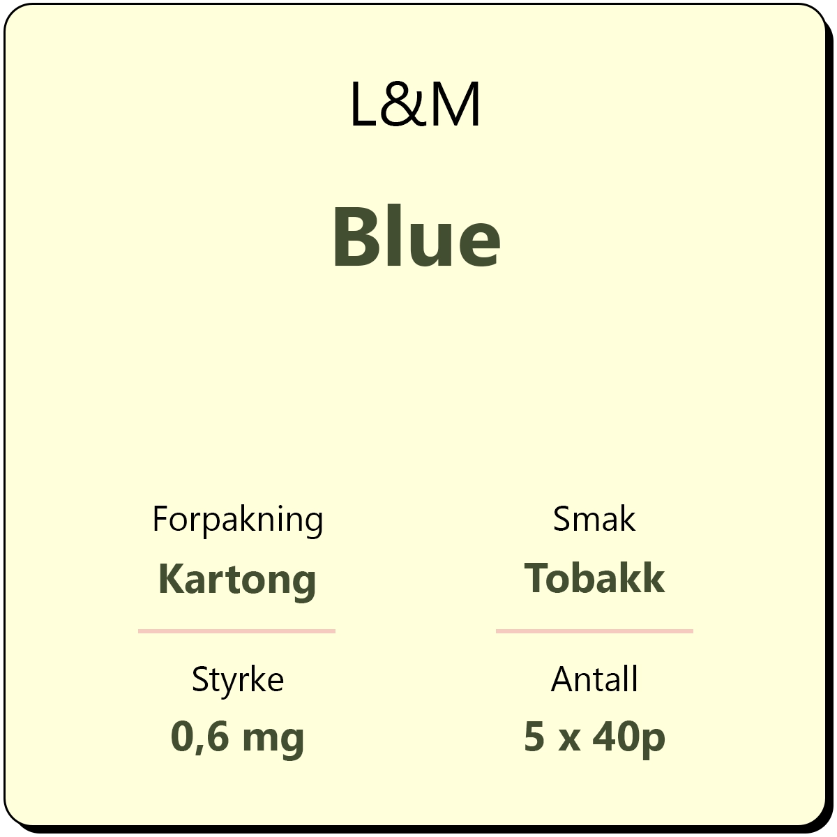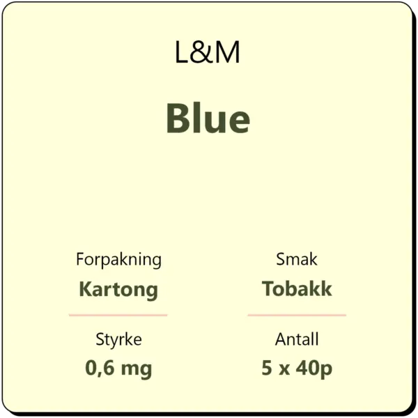 L&M Blue 40 kartong består av 5 sigarettpakker med 40 sigaretter i hver pakke. Dette er en klassisk sigarett med filter fra produsent Philip Morris International.