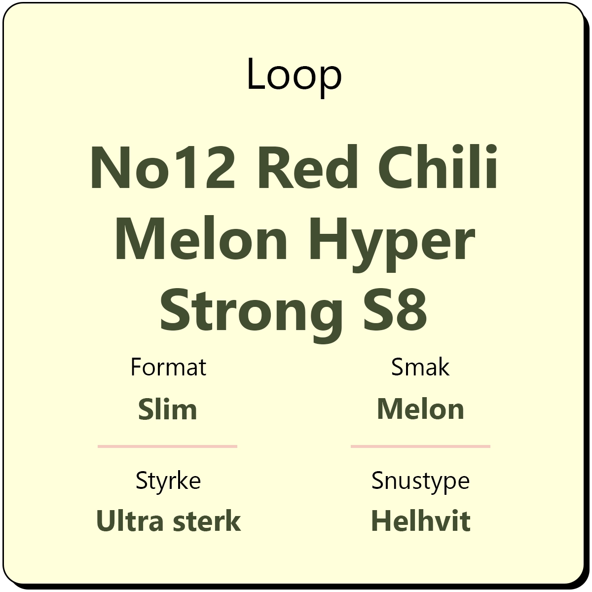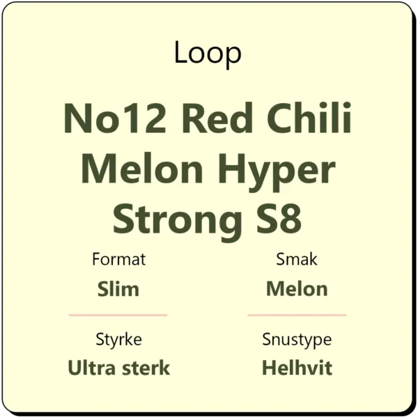 Loop No12 Red Chili Melon Hyper Strong S8 har en smak av melon og rød chili fra Loop. Snusen har et høyt nikotininnhold på hele 25 mg/g. Det gjør den til en ultra sterk snus med styrkegrad S8. I likhet med annen snus fra Loop kommer den i helhvite poser i et slim porsjonsformat.