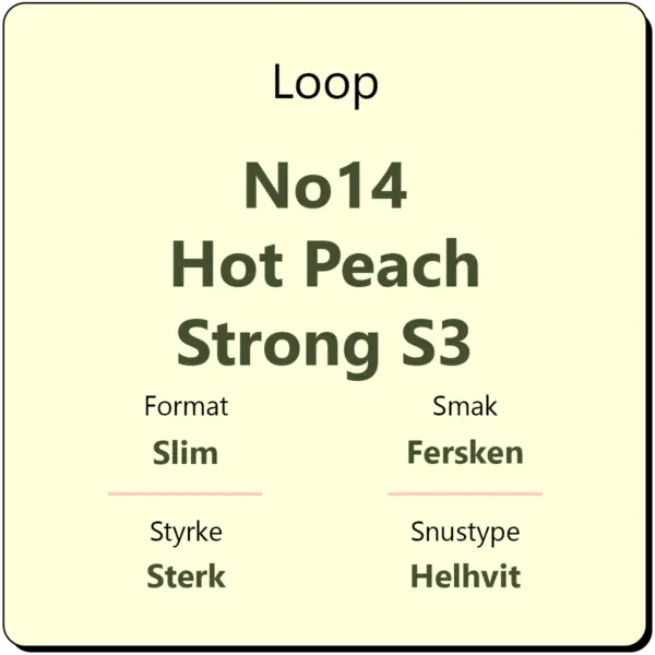 Loop No14 Hot Peach Strong S3 er en middels sterk snus med en tydelig smak av fersken og chili. Snusen har en styrke på 15 mg/g nikotin, tilsvarende styrkegrad S3. I likhet med annen snus fra Loop kommer den i helhvite poser i et slim porsjonsformat.
