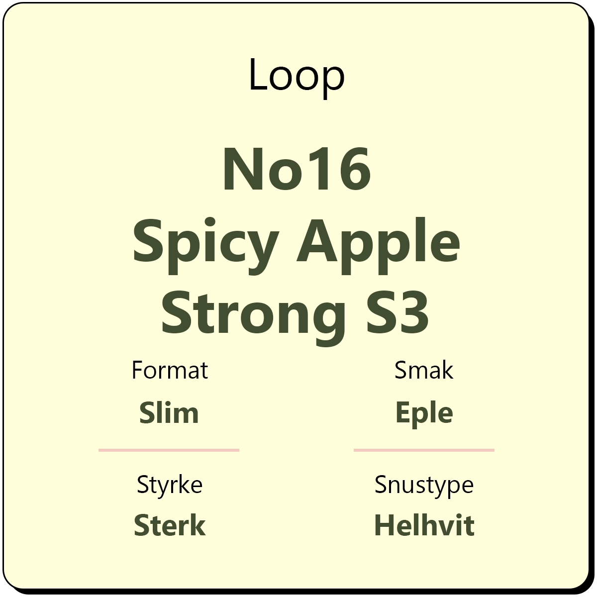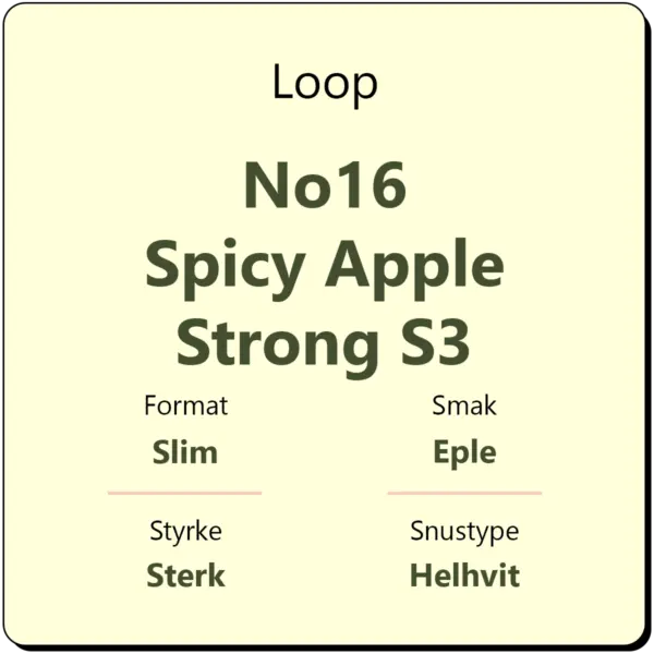 Loop No16 Spicy Apple Strong S3 er en middels sterk snus med en tydelig smak av eple og chili. Snusen har en styrke på 15 mg/g nikotin, tilsvarende styrkegrad S3. I likhet med annen snus fra Loop kommer den i helhvite poser i et slim porsjonsformat.