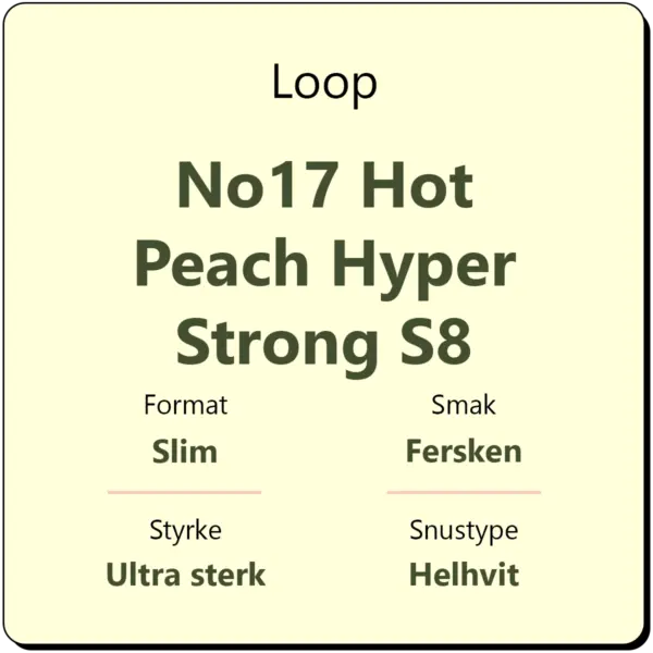 Loop No17 Hot Peach Hyper Strong S8 er en ultra sterk snus med en tydelig smak av fersken og chili. Snusen har en styrke på 25 mg/g nikotin, tilsvarende styrkegrad S8. I likhet med annen snus fra Loop kommer den i helhvite poser i et slim porsjonsformat.